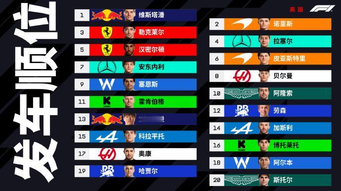赛车:2025F1美国大奖赛排位赛维斯塔潘夺得杆位! 诺里斯第二,勒克莱尔第三,排名四至十位的车手分别是拉塞尔、汉密尔顿、皮亚斯特里、安东内利、贝尔曼、塞恩斯、阿隆索。 正赛发车顺位👇(附图) 正赛将于北京时间10月20日03:00举行。