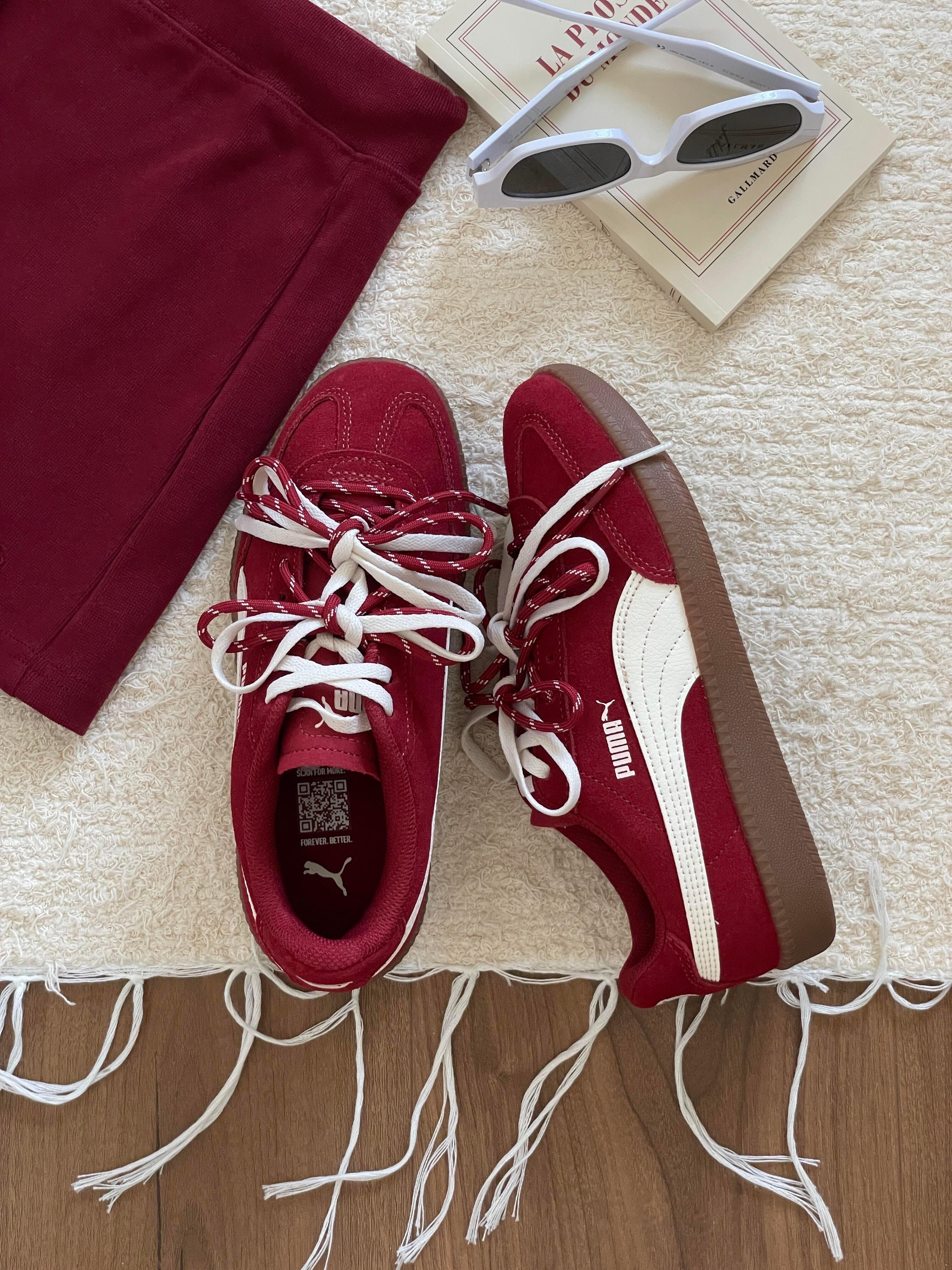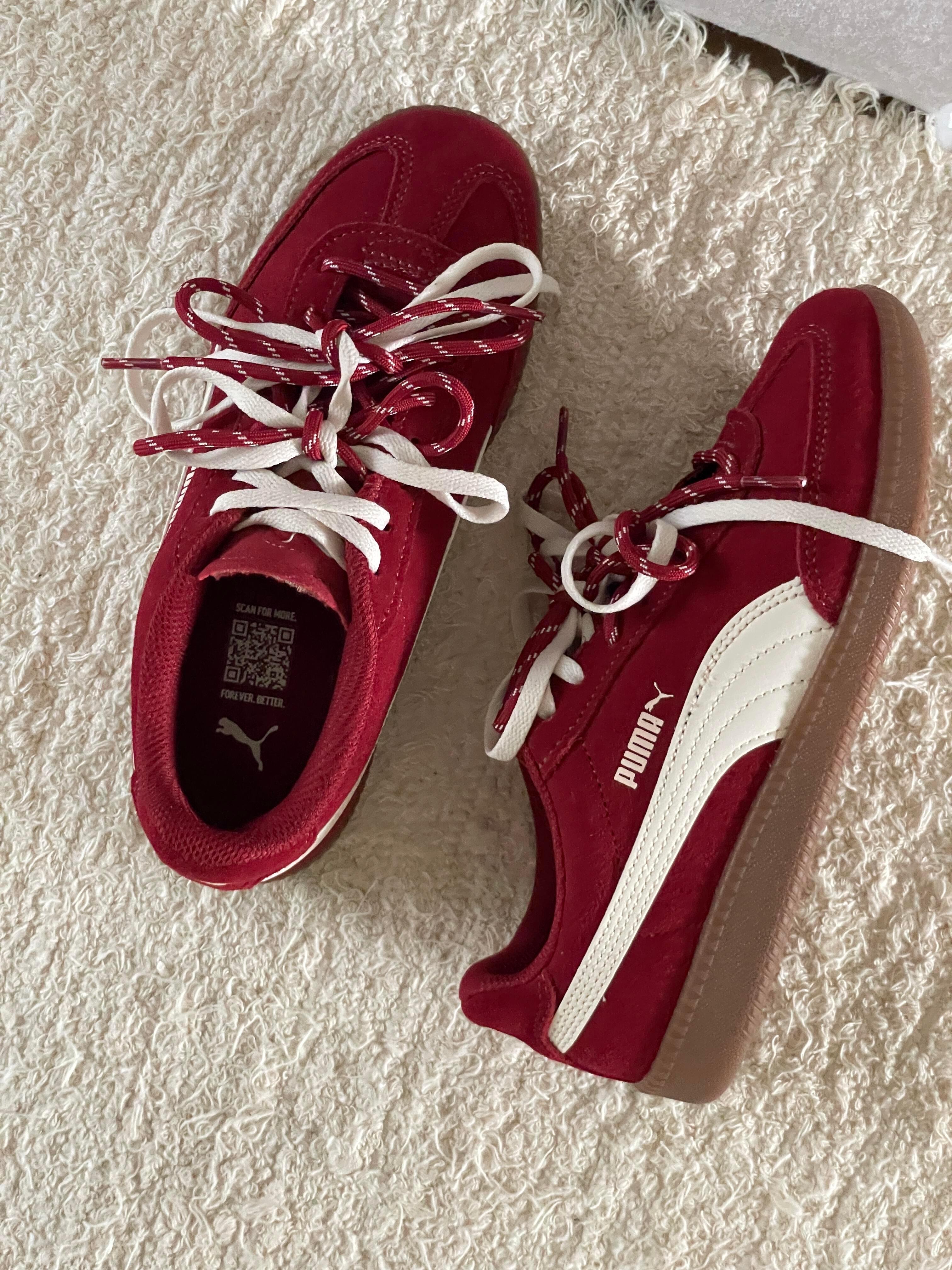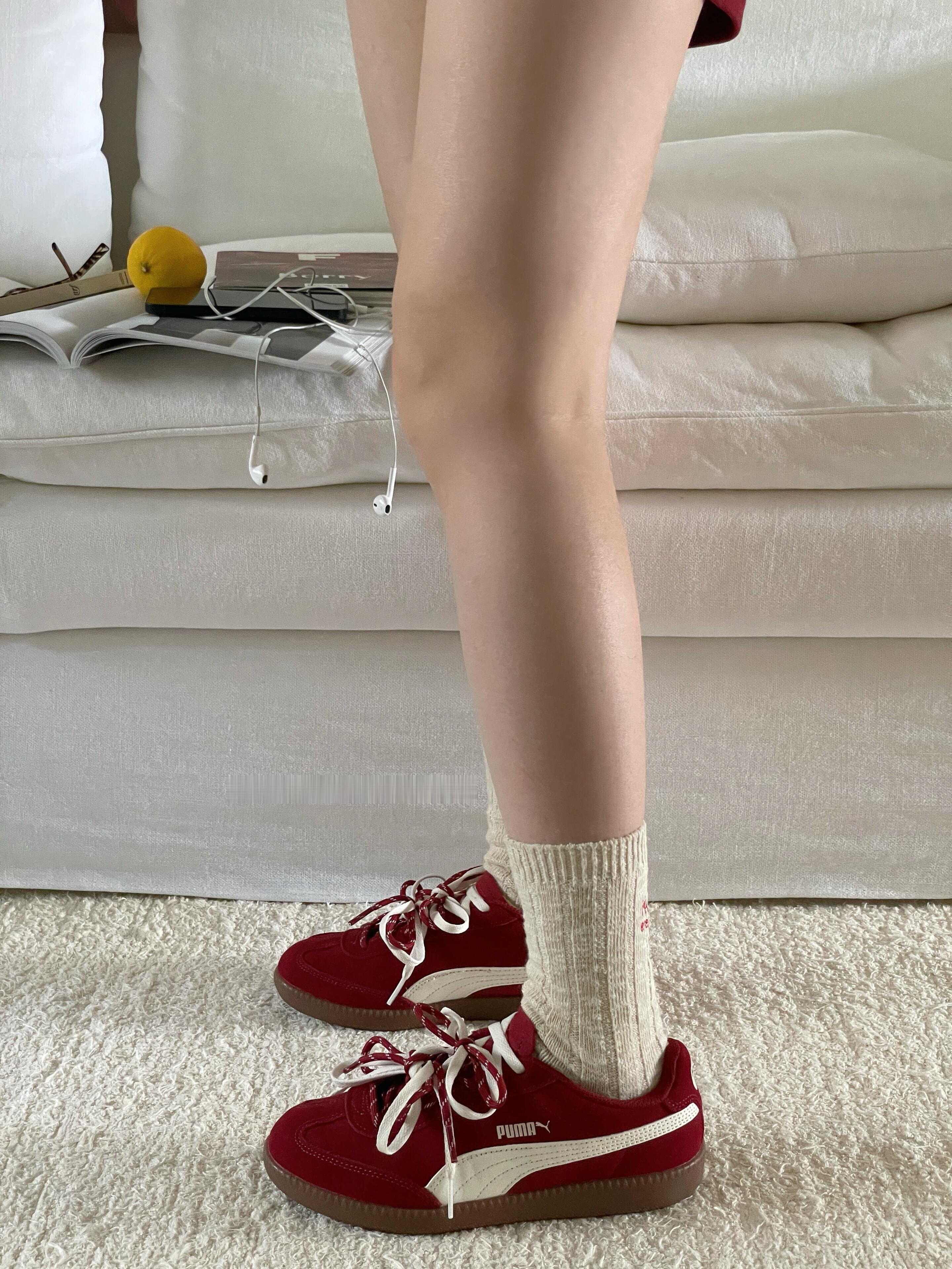 时尚鞋履年度本命小红鞋锁定!这双复古暗红德训鞋直接戳中时尚心巴~ 低饱和暗红调自带高级滤镜,麂皮鞋身纹理质感拉满,细节处尽显腔调!薄底设计太懂都市人,上脚轻盈如踩云,通勤暴走、轻运动切换无压力,百搭属性让衣柜里的基础款都能瞬间提亮,时髦精的早秋氛围感全靠它拿捏~sotd鞋控的日常