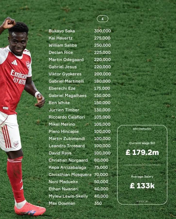 列表包括了25名球员,从顶薪的萨卡(30万英镑)到最低薪的道曼(350英镑)。