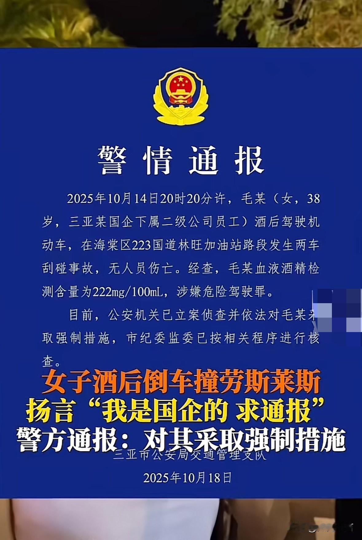 现在还有这么头脑大条的人吗?三亚一女子喝酒后倒车碰上一辆劳斯莱斯,对方报警,她居然对着警察说她是国企的,让市委市政府去通报她 最后检测结果显示女的酒精含量严重超标,涉嫌危险驾驶,已经被采取强制措施 但等待女子的恐怕还不止于此,她的确是某国企员工,所以这件事曝光后,她所在的公司肯定要解除与她的劳动合同,因为她不仅违法,还拿着自己国企员工的身份要挟警察,已经违纪 也不知道这是谁家的“宝贝”,怎么敢让她一个人出来,相信她能说出这种话绝不是酒喝多了胡言乱语,平时应该就是这么嚣张跋扈 如今她求仁得仁,市委市政府通报她是不够格的,但单位通报肯定是跑不了的,也许会成为全市乃至全省国企系统的负面教材 最惨的应该是她老公了,出狱后她老公会不会跟他离婚?