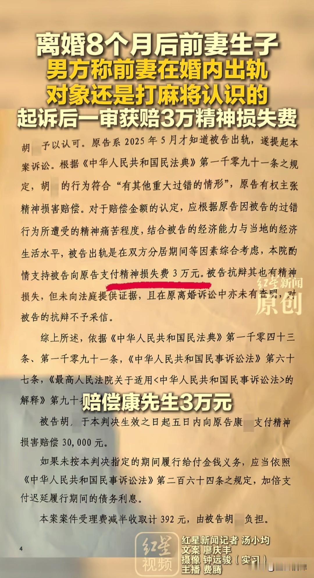 绵阳康先生在离婚八个月后发现前妻又生下了一个孩子,他确定孩子不是自己的,康先生起诉前妻胡女士,请求法院判定对方支付婚内出轨精神损失费10万元。 康先生和妻子胡女士结婚6年,两人育有一子,去年10月15日离婚,今年6月12日前妻又生下一个孩子,胡先生说前妻经常打麻将,后面查到在2022年就婚内出轨茶楼老板。 康先生说前妻和她起诉离婚的时候就已经怀孕几个月了,也亲口承认了婚内出轨事实,他现在就是要维护自己的合法权益,该让对方赔偿就要赔偿。 来源:红星新闻