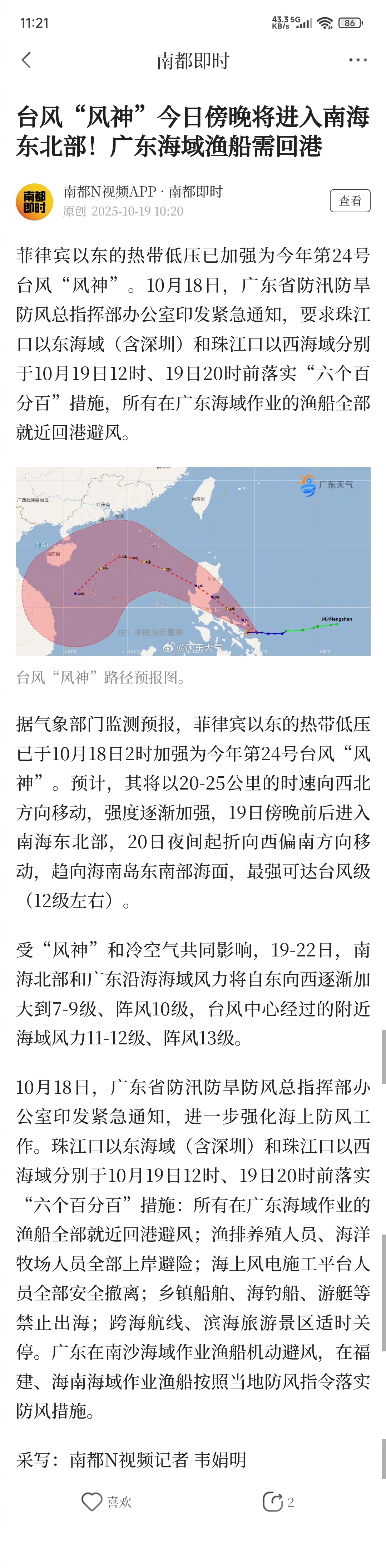 #广东海域渔船全部回港避风#【台风“风神”今日傍晚将进入南海东北部!广东海域渔船需回港】#下一个台风叫风神#菲律宾以东的热带低压已加强为今年第24号台风“风神”。10月18日,广东省防汛防旱防风总指挥部办公室印发紧急通知,要求珠江口以东海域(含深圳)和珠江口以西海域分别于10月19日12时、19日20时前落实“六个百分百”措施,所有在广东海域作业的渔船全部就近回港避风。