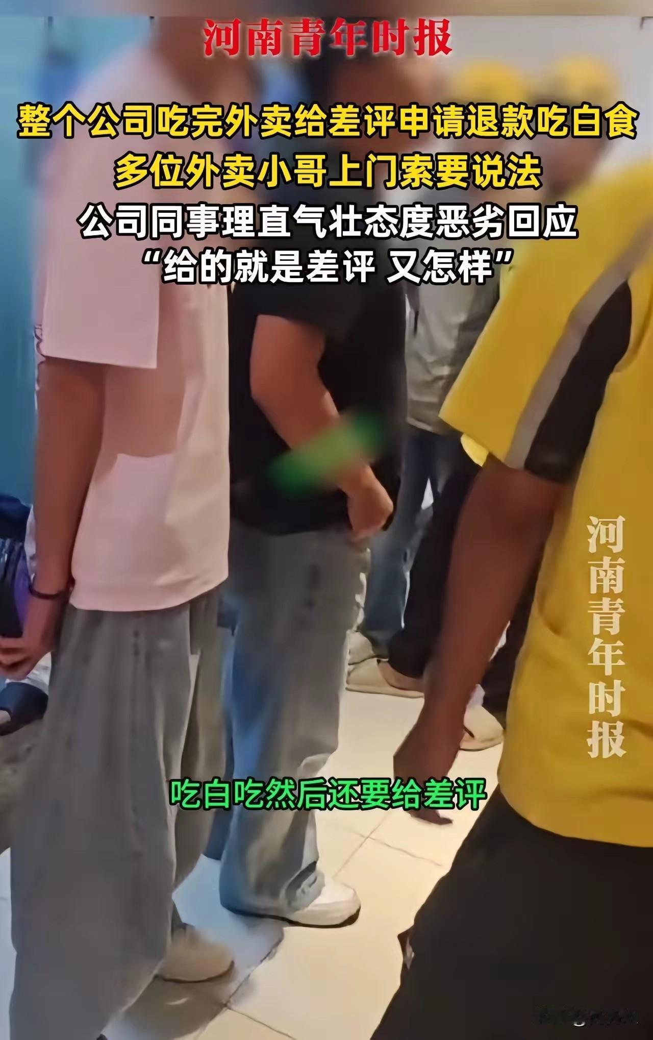低素质集中营! 深圳某公司的多数员工吃完外卖申请退款吃白食,完了还反手给外卖小哥差评!外卖小哥们忍无可忍,集体上门讨说法。但是员工反而理直气壮,态度恶劣的回应:“给的就是差评,又怎么样?” 网友评论: 个别人烂就算了,一整个公司的人都这样,什么样的公司能凑齐这样一群人 感觉像是诈骗公司,要不就是催收公司。否则不可能有这么多低素质的年轻人! 平台把风险转嫁给骑手,只要赚钱牺牲骑手利益就是理所应当,有些客户完全可以被平台拉到黑名单,这种人就不配享受外卖服务! 这家公司肯定不是什么正规公司,否则哪有这么不要脸的,不考虑公司名声的 报警,看警察对这群吃白者怎样处理并直播全国让各谋体报道这群混吃喝者 这公司把无耻两个字体现得淋漓尽致,平台也不什么好鸟,只知道抽成,把所有的责任推给骑手