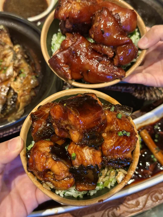 还没进门就被明档厨房香晕了,不是预制菜!真的超安心 推荐他家猪蹄煲,软烂到脱骨,胶原蛋白拉满,拌饭 更是一绝,汤汁浸满的大米饭。还有鳗鱼也太入味了,真的是两米饭杀手 重点夸夸他家甜品!甜度刚刚好,吃完咸的来一口直接升天! 啊啊啊啊啊本人实在太爱了!!
