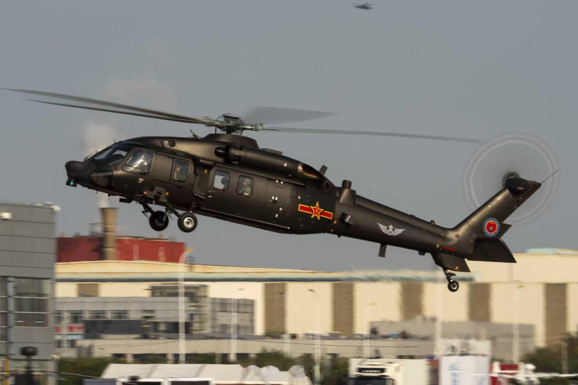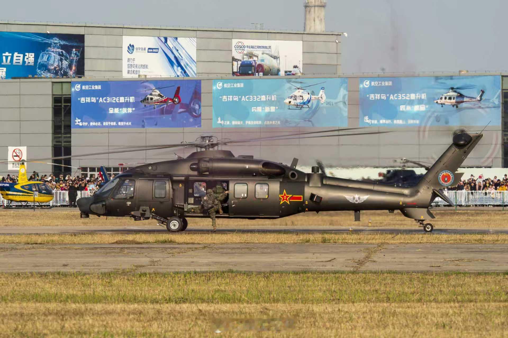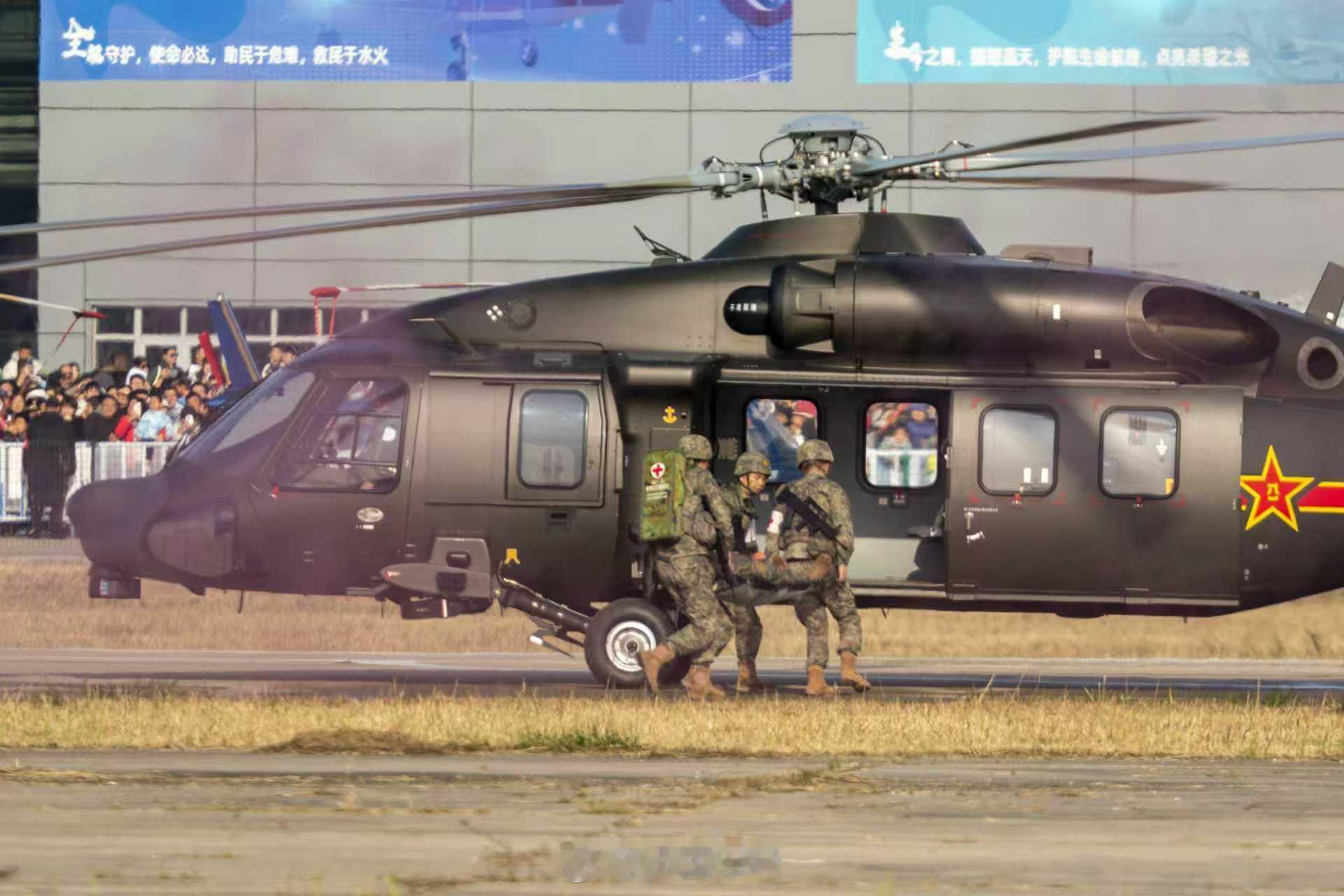 【直20携救护队员实施紧急营救】天津直博会现场,两架直-20以低空突进姿态编队进入,舱内的救护队员对营救地域进行全面观察;另一架直-10在编队后方进行战术警戒,与长机“交叉掩护、动态协同”,建立空中火力网,持续监控营救地域动态。救护队员迅速实施营救,并快速撤离。(黄雨桥 王一帆 孙彩宇)