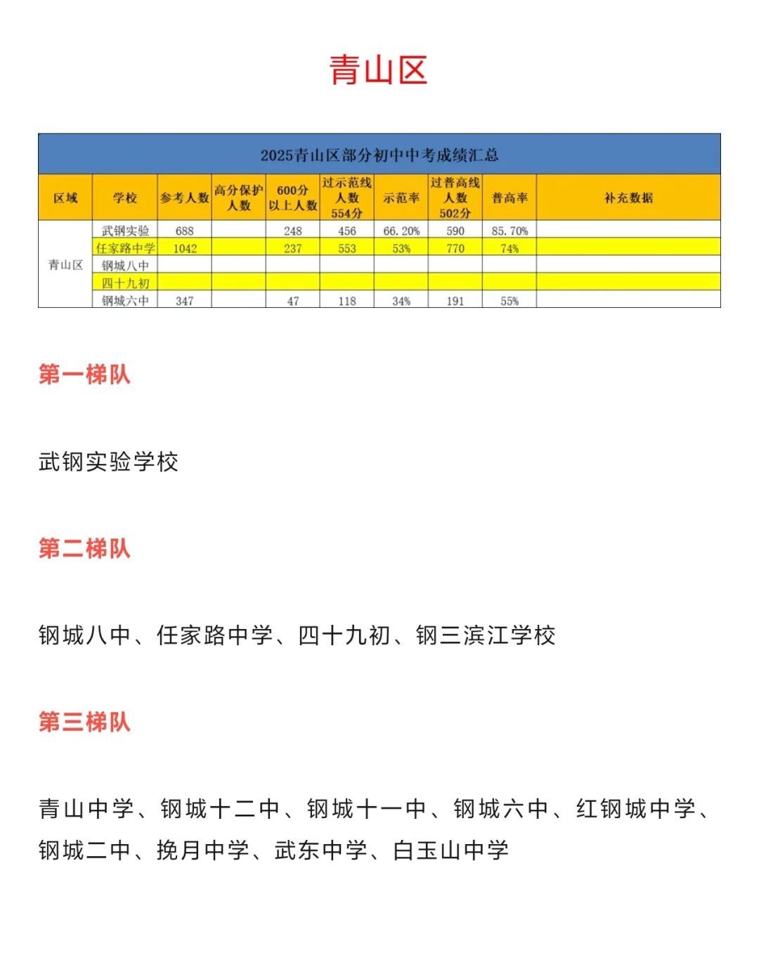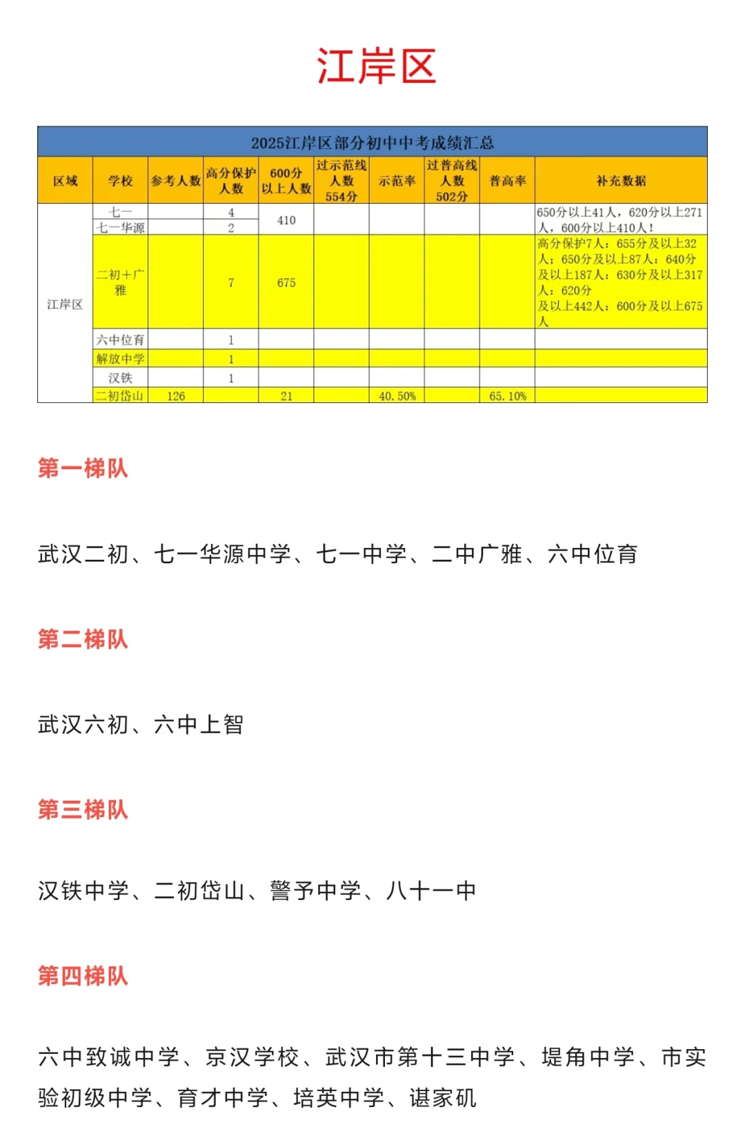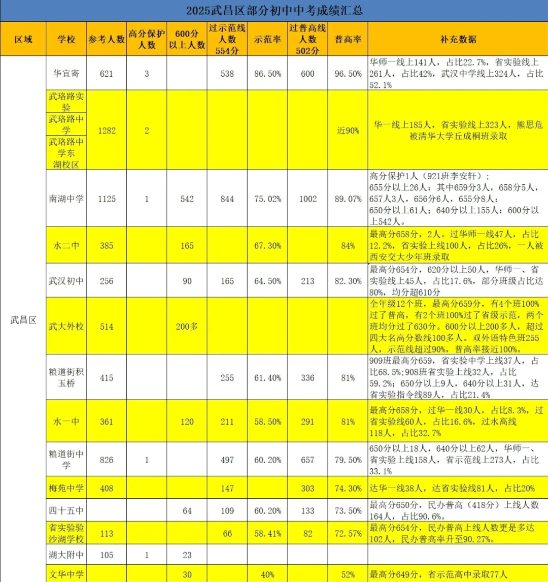 我们如何评判一个学校到底好不好,在目前仍然是以应试教育为主的时代,简单点,就是成绩,虽然说大家都在说教育改革,但是有能力的家长还是会尽可能的把孩子送到有成绩,更有保障的学校,那么武汉初中目前的蕞新情况如何,哪些学校成绩更好,更有保障,今天大白就从目前已知的部分学校普高率,示范率,包括高分来给大家概括一下,武汉目前蕞新的初中梯队排名(仅供参考,部分学校数据未公示)