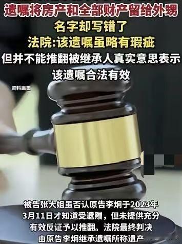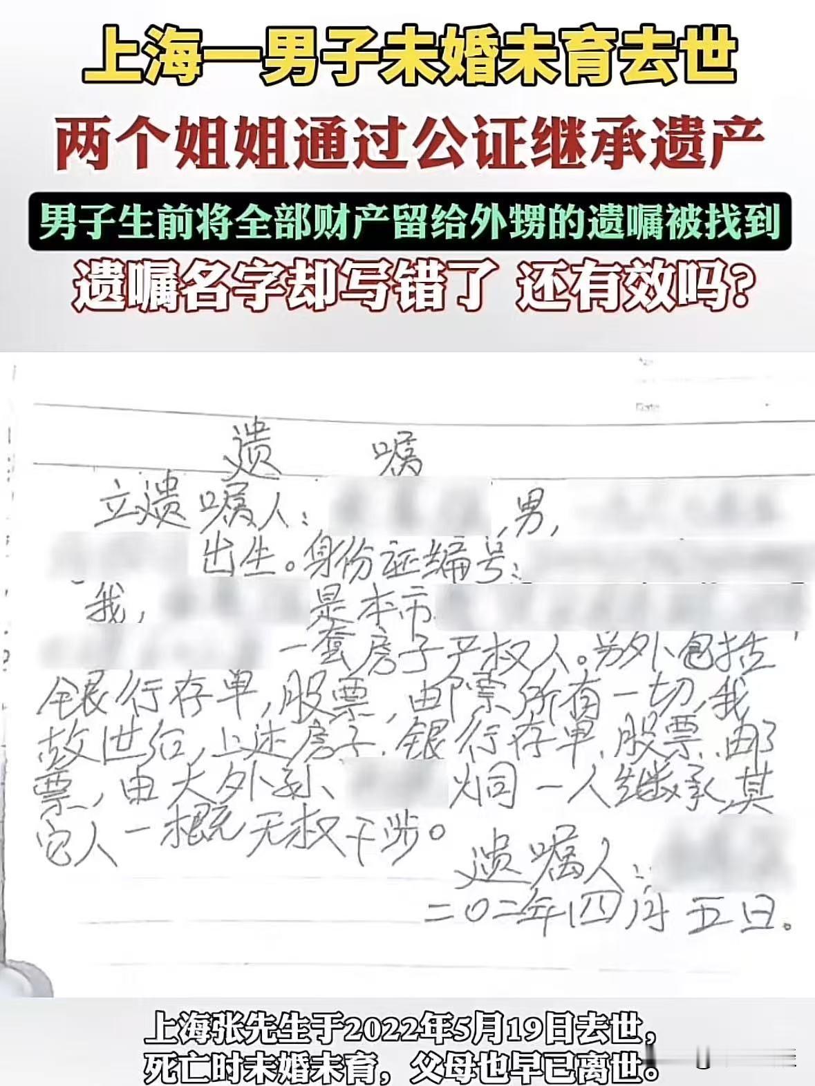 上海,男子的舅舅一生没结过婚,也没有子女,离世后遗产由两个姐姐继承,男子为舅舅办理了后事,后来男子在收拾舅舅的遗物时,意外发现了一张遗书,上面明确写着遗产由外甥继承,他思来想去跟自己的母亲诉说了此事,母亲得知后将此事告知大姐,大姐认为遗产已经分完,而且遗嘱上错别字将外甥李炯写成李烔,外甥写成外孙,所以不认可遗嘱,双方协商不成,最终双方对薄公堂,没想到法院的判决让人意外! 李炯的舅舅这辈子,没结过婚,也没孩子,平时话不多,但是谁见了都觉得和蔼可亲。 他有两个姐姐,大姨(大姐)结婚后离得远走动的也少,一年都见不了一两面。 相比较李炯的母亲(二姐)跟他走的就比较近,这些年一直相互陪伴。 李炯从小就爱调皮捣蛋,一惹祸就往舅舅家跑,至少能免一顿揍,大了以后也隔三差五跑去陪舅舅。 跟舅舅聊聊天,吃吃饭在遛个弯,做这些不是为了别的,仅仅是跟舅舅比较亲。 没成想,2022年5月19号,舅舅还好好个人,突发疾病,走的特别突然,连句话都没有留下。 舅舅的离世对李炯的打击特别大,他怎么也想不明白,舅舅平时身体还不错,前几个月还带他去体检,也没啥问题啊。 母亲劝他人都有老的那天,舅舅走的一点都没遭罪,也算是有福之人。 还劝李炯,舅舅知道你这么孝顺也能安息了,这辈子也没算白疼你。 李炯风风光光把舅舅厚葬,他名下的房产,存款以及股票等财产,按照规定,没有配偶及子女,父母也不在的情况下,自然就由两个姐姐继承。 最后两家人在工作人员的见证下申请了遗产继承公正,所有遗产两家平分。 就这样日子还是照常过,2023年3月11日,李炯推开舅舅的房门,想要收拾收拾他的遗物,整理好了也算留个念想。 谁知意外收拾出一张泛黄的信封,上面是舅舅熟悉的字迹,一笔一划写着“遗书”两个字。 李炯的心一下子提到了嗓子眼,手抖着拆开信封,里面是一张泛黄的信纸,字迹有些潦草。 遗嘱的意思就是我这辈子无儿无女,承蒙外孙李烔一直照顾,百年之后,名下所有财产,包括房子和存款,都归李烔所有。 看完后,李炯哭花了脸,他认为自己照顾舅舅是应该的,没想到他居然记在心里,还专门写了遗嘱。 他现在后悔舅舅在世的时候,没有更多的陪伴他老人家。 得到舅舅的认可,他很是感动,但问题是,遗产已经分完了,现在拿出遗嘱怕是会影响两家的关系。 他收拾完舅舅的遗物以后,揣着遗嘱回了家,思来想去还是跟母亲说了这个事。 母亲拿着遗嘱看了半天,眼圈都红了,说这是你舅舅,拿你当亲儿子了,啥都惦记你。 但又皱着眉觉得这事不好办,毕竟遗产都分完了,你大姨那边怕是不好说。 纠结了一晚上,母亲还是决定跟大姨说实话,毕竟是舅舅的遗愿,瞒着也不是办法。 没想到大姨听完,第一反应就是不认可,遗产都分完了好几个月了,怎么突然冒出个遗嘱。 而且她还提出,遗嘱里都是错别字,‘李烔’不是‘李炯’。 把外甥也写成了外孙,连落款日期都不对,这明显就是写错了,说不定是你舅舅老糊涂了写的,不算数! 李炯解释,舅舅文化程度不高,平时写字也是这样错别字很多,再说咱家也没有跟我名字很像的人。 不管李炯他们怎么说,大姨就是不松口,遗产已经分完了,这遗嘱也没公证,不算数。 就这样两家人就这么吵了起来,原本挺亲的亲戚,一下子就生分了。 商量了好几次,都没个结果,大姨最后放话说:要告就告,我不怕。 眼见双方协商无果,最终只能对簿公堂。 《民法典》第1124条:该条规定受遗赠人应当在知道受遗赠后六十日内,作出接受或者放弃受遗赠的表示;到期没有表示的,视为放弃受遗赠。 李炯在2023年3月11日发现遗嘱,跟母亲协商想要继承遗产,转天和大姨联系,其中电话记录和微信聊天等证据都能证明。 《民法典》第1123条:继承的优先级,即有遗赠扶养协议的,按照协议办理;没有协议有遗嘱的,按照遗嘱继承或者遗赠办理;既没有协议也没有遗嘱的,按照法定继承办理。 虽然舅舅的两个姐姐之前已经办理了法定继承公证,但后来发现了舅舅的自书遗嘱,且该遗嘱合法有效,所以应当按照遗嘱继承,由李炯继承舅舅的遗产。 后来,法院审理时,考虑到老张一辈子没读过多少书,文化程度有限。 日常写字本就容易出错,再加上上海方言里外甥和外孙发音相近,出现口误式笔误能理解。 更关键的是,老张终身未婚,从来没有过子女,自然不可能有外孙。 亲戚里也压根没有叫李烔或者名字跟李炯相近的人。 这就很清楚的表达遗嘱里写的大外孙李烔,其实就是指大外甥李炯。 所以这份自书遗嘱合法有效,最终判决所有遗产都由李炯继承。 这个结果大姨难以接受,她觉得自己作为法定继承人,不该就这样失去遗产,于是以起上诉。 二审认为一审事实清楚法律适用得当,驳回了大姐的全部诉求,维持原判。 那么,对于这个结果,你怎么看呢? @静心法谈 学法辨是非,慬法不吃亏。