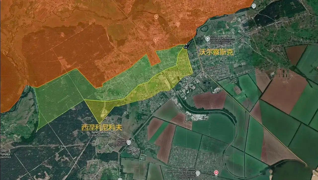 俄军在哈尔科夫北部沃尔昌斯克的进展。大部分市区已经被俄军占领,大部分乌军补给线也