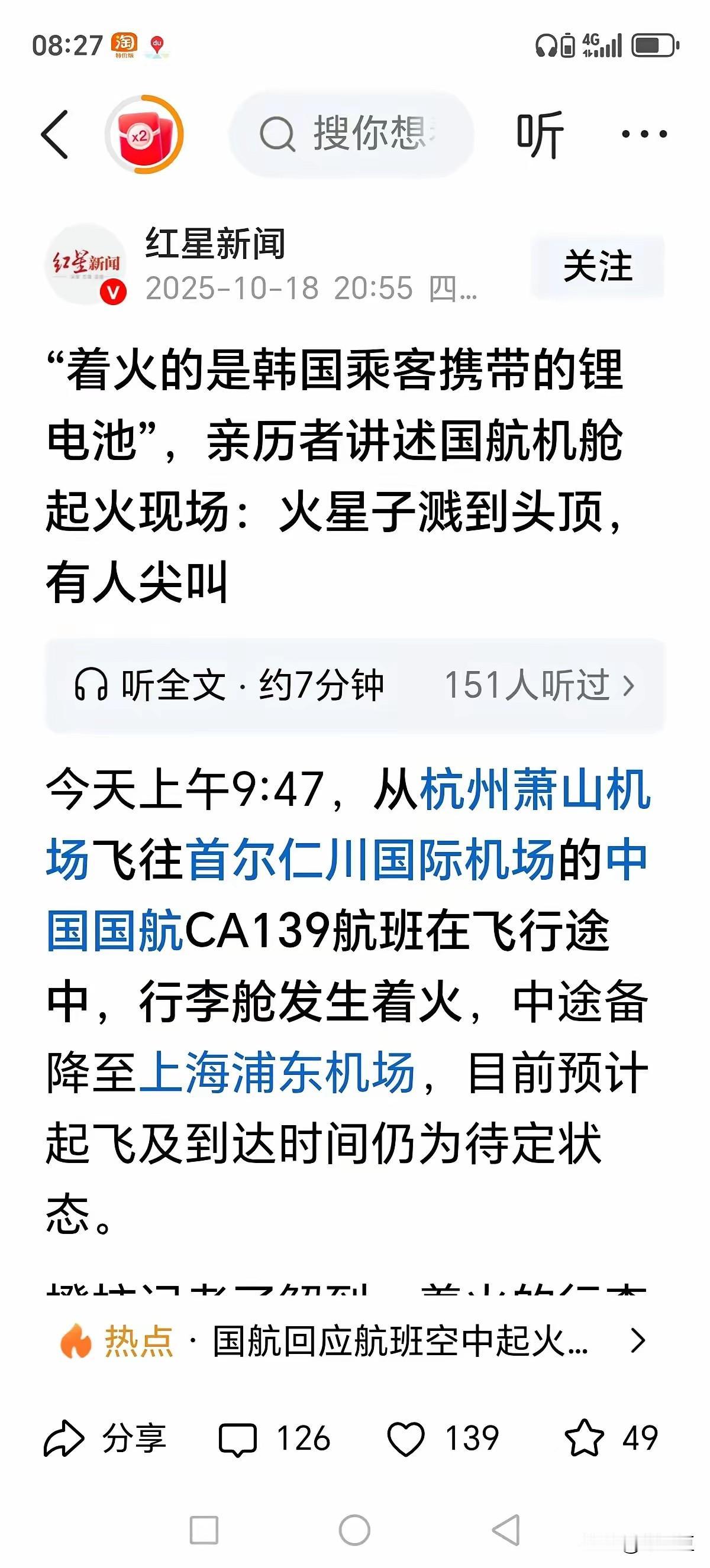 韩国人咋带的锂电池上飞机? 坐过飞机的,或者说看过新闻的大家都应该对飞机上对充电宝等电池产品的安检是有要求的,很多是不允许带上飞机的! 国航,韩国旅客带上去了,不但带上去了,还挺显眼的着了一把火,这不是简单的把大家吓了一跳的问题,这是影响飞航安全的问题,这是把一飞机人的生命安全置于危险之中了! 厦门饭店,不允许穿拖鞋进入,外宾可以。高铁,外籍人士推车上!这些都可以忍,但我想说一句,涉及到生命财产安全就不要区别对待了吧?希望国航能追责,能给老百姓一个说法,毕竟一飞机的人命啊!