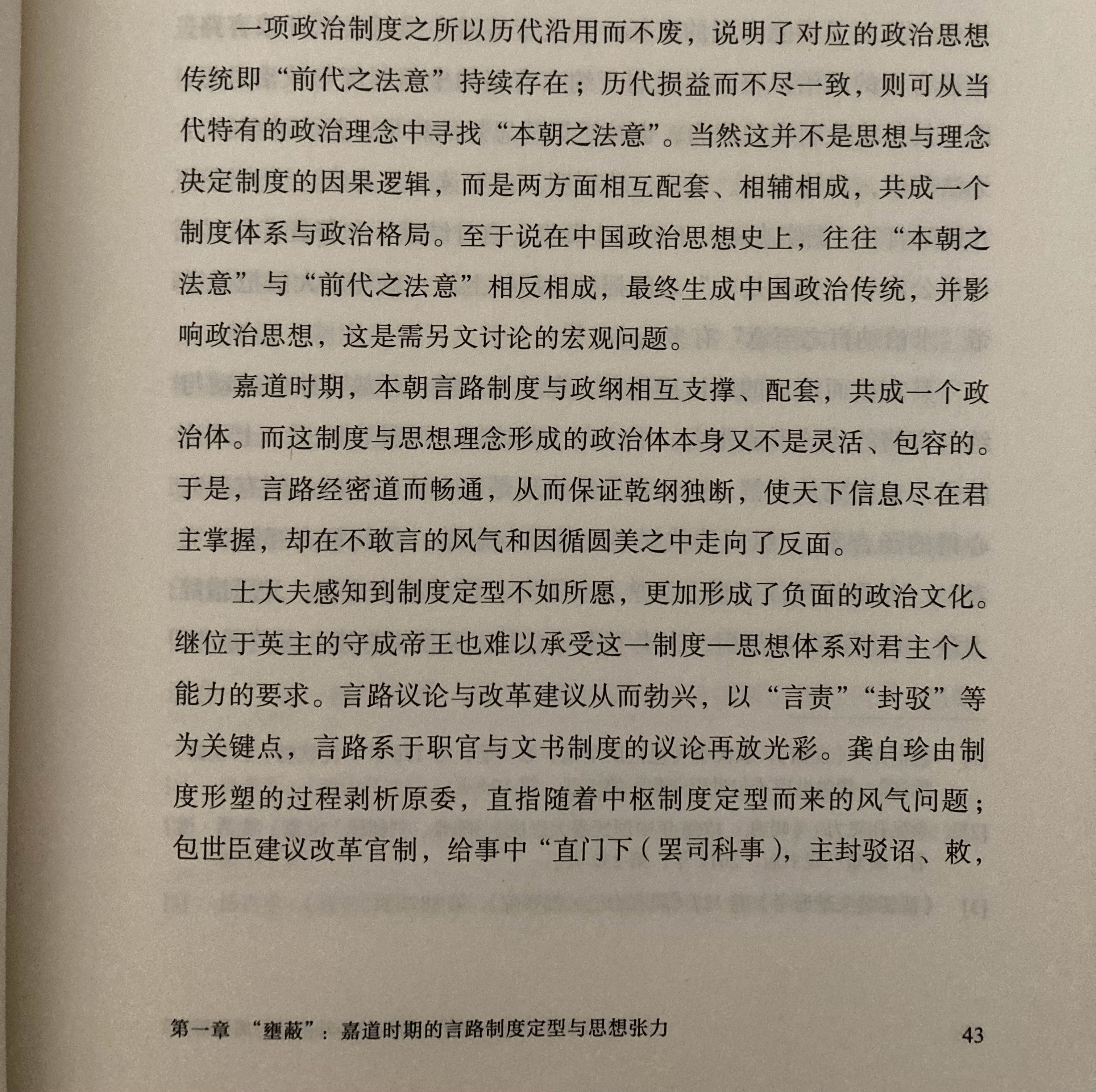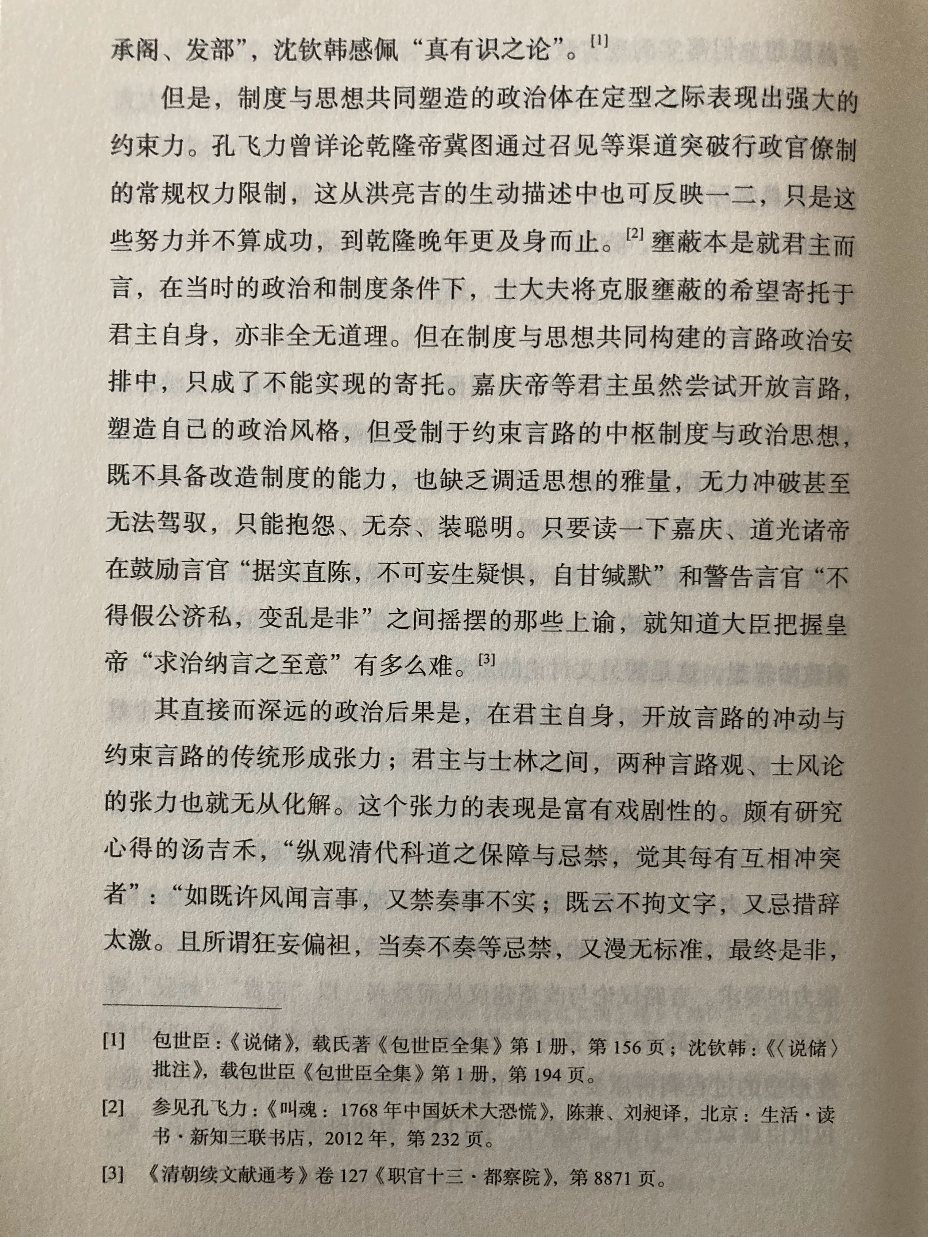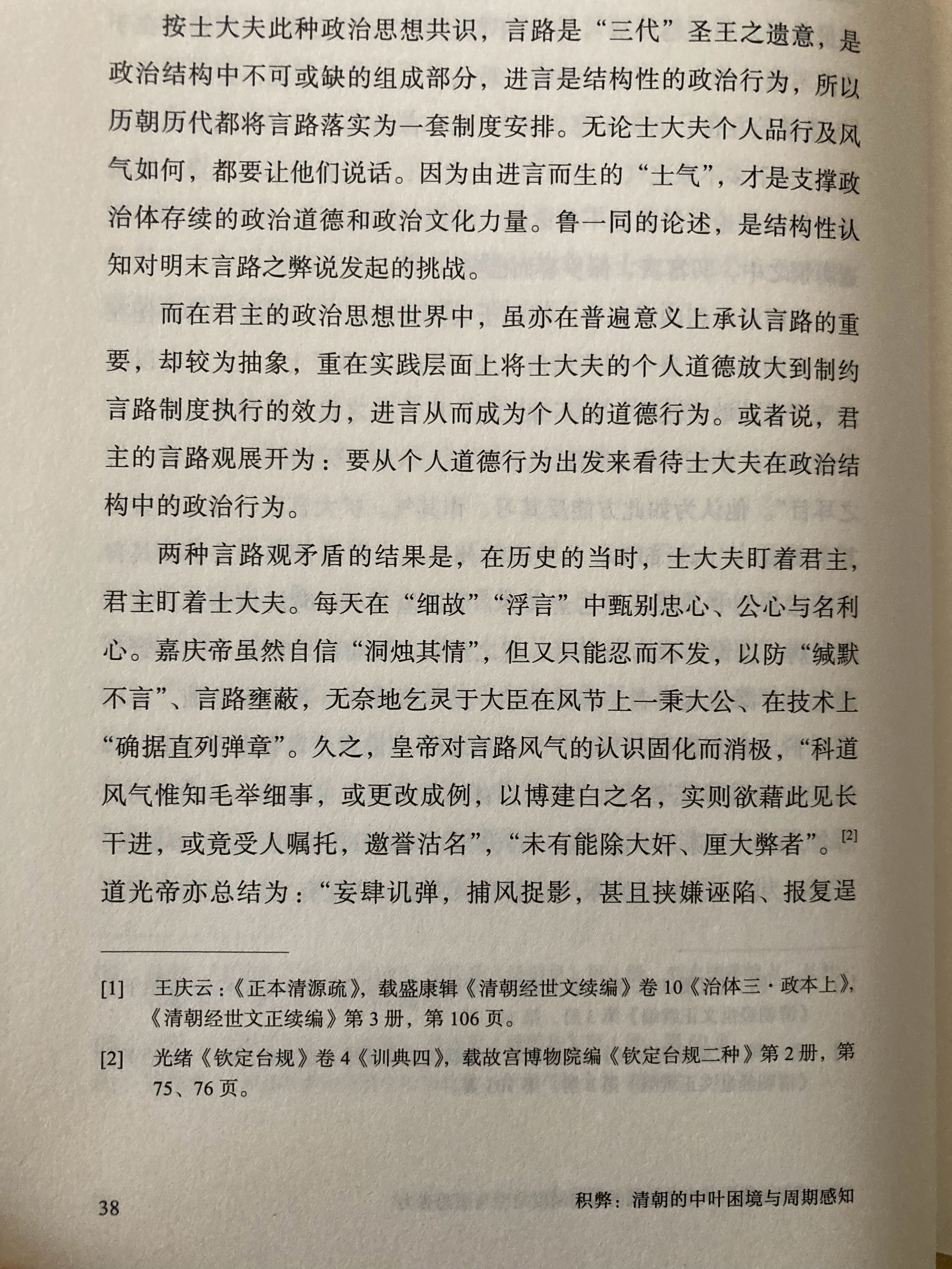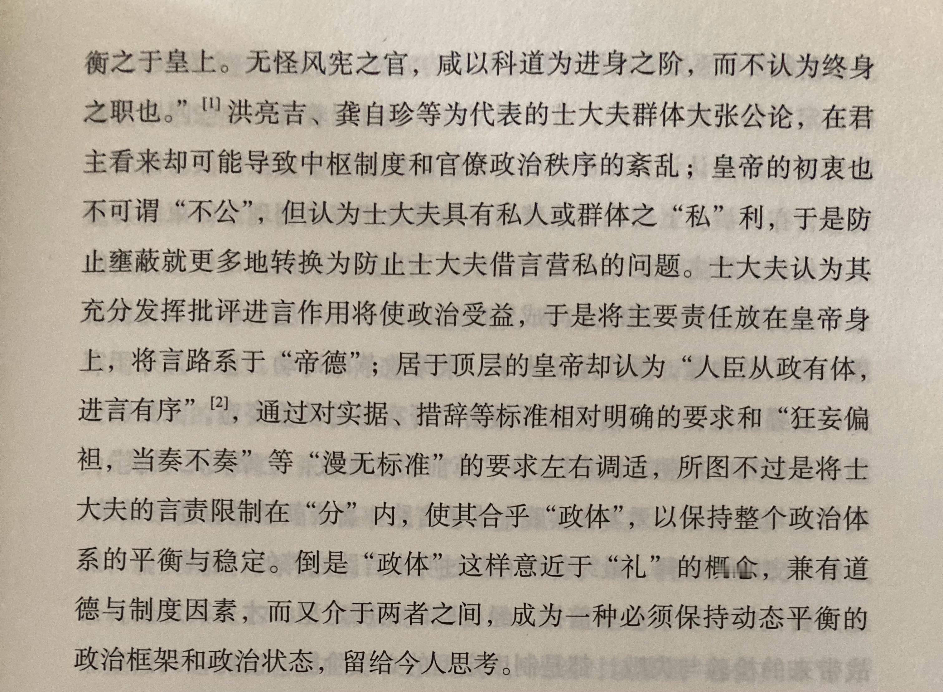 洪亮吉、龚自珍等为代表的士大夫群体大张公论,在君主看来却可能导致中枢制度和官僚政治秩序的紊乱;皇帝的初衷也不可谓“不公”,但认为士大夫具有私人或群体之“私”利,于是防止壅蔽就更多地转换为防止士大夫借言营私的问题。士大夫认其充分发挥批评进言作用将使政治受益,于是将主要责任放在皇帝身上,将言路系于“帝德”;居于顶层的皇帝却认为“人臣从政有体,进言有序”,通过对实据、措辞等标准相对明确的要求和“狂妄偏袒,当奏不奏”等“漫无标准”的要求左右调适,所图不过是将士大夫的言责限制在“分”内,使其合乎“政体”,以保持整个政治体系的平衡与稳定。倒是“政体”这样意近于“礼”的概念,兼有道德与制度因素,而又介于两者之间,成为一种必须保持动态平衡的政治框架和政治状态,留给今人思考。(孙明《积弊》)