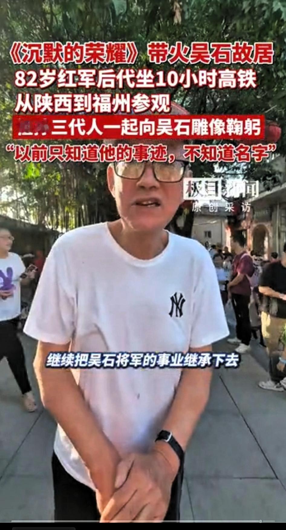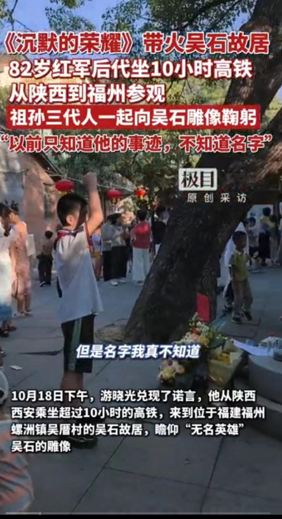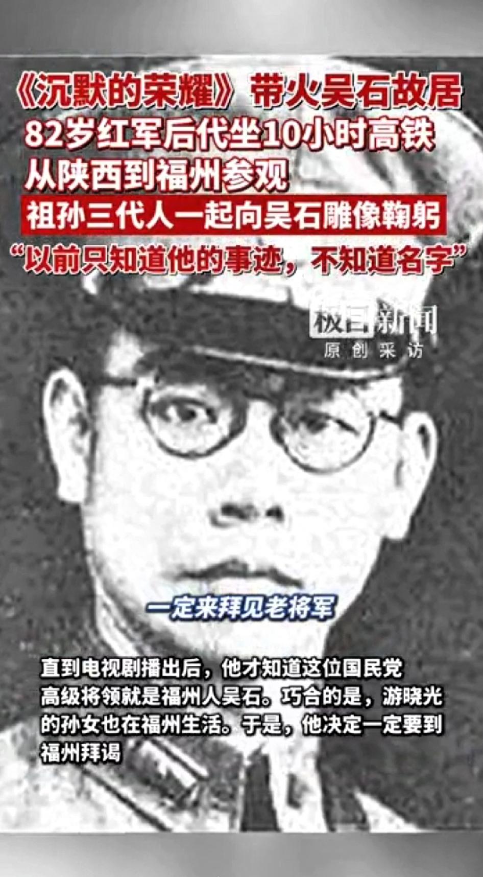 《沉默的荣耀》带火吴石将军的故居 82岁红军后代坐10小时高铁从陕西到福州参观! 祖孙三代一起向吴石将军雕像鞠躬! 以前只知道他的事迹,不知道他的名字! 直到电视剧播出后,他才知道这位国民党高级将领就是福州人吴石。 巧合的是,老人的孙女正好在福州生活。于是,他决定到福州拜谒。 剧播前一天最多80人,一下翻了15倍,讲解员加到第8批都不够用。 福建还串起“红色谍战专线”,大巴上循环放剧里名场面,导游用台词解说,游客对“暗号”,氛围感超棒。 北京福田公墓的吴石墓,2023年第四季度祭扫登记量暴涨300%,还有人花200请志愿者代祭扫。 甚至台北的马场町纪念公园也受影响。82岁红军后代坐10小时高铁来,想必也是被剧和吴石将军的精神所感召。