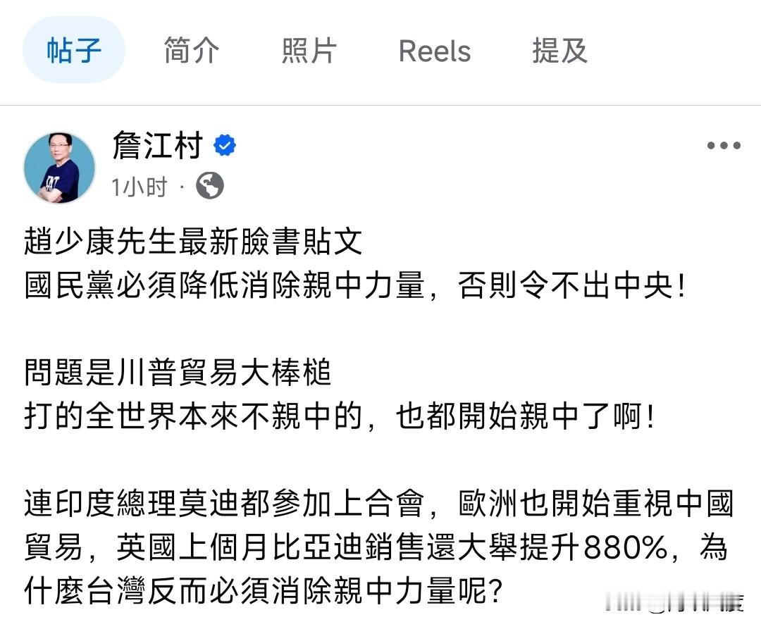 时隔24小时后,赵少康终于发声,通篇不提郑丽这,也没有祝贺。网友千则留言灌爆脸书,惊问你是民进党发言人吗? 时隔24小时后,赵少康终于在脸书发了一篇长文,但通篇没有一句祝贺郑丽文当选的话,甚至连郑丽文名字都不愿提。反而在文中写道:“这次投票率仅有39%,是因为一部分气愤黄复兴党部被裁撤,一部分期待改革,一部分是参选人亲中。” 他同时表示:“如果不消除亲中力量,否则令不出党中央,中央党部成为党主席一个人的武林,固然还是可以舞的虎虎生风,但无法整合立法机构与县市长力量,也无助于公职候选人选举,非常可惜。” 发文1小时收到上千条留言,但基本上是对赵少康一边倒的批评。网友表示,“看到赵少康讲这些我很震惊,我还以是民进党人的发言。”、“赵,晚节不保,你可以退休了”、“从他年轻看到现在,这次我真的不认同你。”、“唉唉唉,我以为你是一位君子”、“易经说闭口是修行,也不知道对还是不对,有一种时候,说越多错越多,只会让人贬低,是这样吗?”、“搞半天你也慢慢往台独那去。”、“本来还蛮认同你,现在只觉得你私心有够重,更有输不起的感觉,你还是滚远一点。”有网友酸道,“谢谢赵先生,只是你的脸书留言怎么这多简体字啊?”其实满屏都是繁体字,该网友酸得很高级。 对此桃园议员詹江村对赵少康的发文回应道:“赵少康先生最新脸书贴文,国民党必须降低消除亲中力量中,否则令不出中央!问题是川普贸易大棒槌,打的全世界本来不亲中的,也都开始亲中了啊!连印度总理都参加上合会,欧洲也开始重视中国贸易,英国上个月比亚迪销售还大举提升880%,为什么台湾反而必须消除亲中为量呢?”狠打了赵少康一记耳光! 选举已经结束,赵少康沉淀了一天,就鼓掏出这样一篇文章,不仅没有一句祝贺,还通篇在说三道四,不知道这是在下指导棋,还是煽动诸侯“造反”。不知道这是要把国民党弄强大,还是要继续把国民党搞垮。不过令人关注的是,投票前,赵少康举办记者会,还用“大陆当局”介选一词,现在通文指称“亲中”,怪不得网友网友批评,赵少康,你也慢慢往台独那去了!