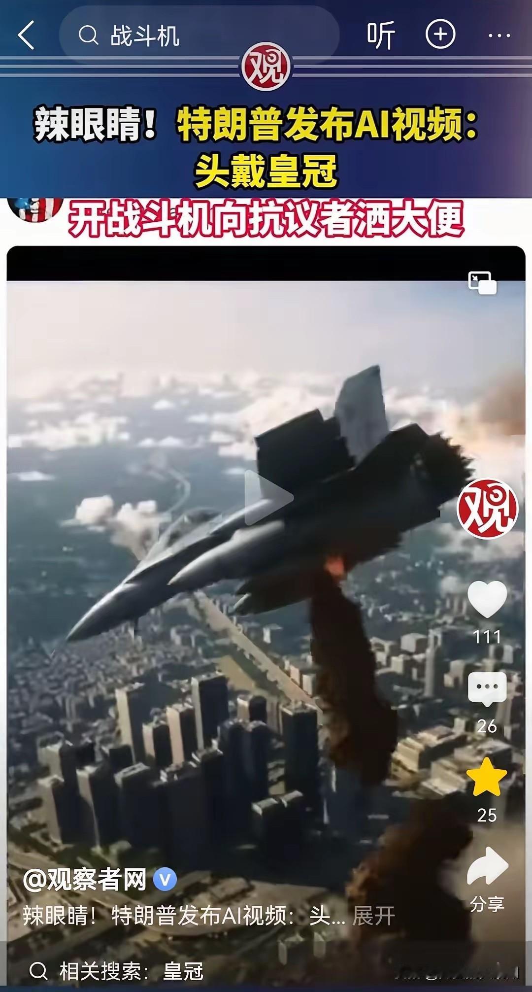特朗普真是个人才,本来美国自己的游行示威全美都瘫痪了,特朗普竟然还在搞笑。他发了一条ai视频,是他驾着战斗机向游行示威人群撒下大粪。 特朗普真是抽象派,这回他可真成了“粪斗机”驾驶员了,全美700万人上街喊“不要国王”,他反手就用AI给自己扣上王冠,说句实在话,这操作,说是小学生打架都嫌幼稚,还偏偏发生在美国总统身上。 一边是政府停摆、军人领不到工资、联邦雇员靠抗议讨薪,另一边是总统和副总统万斯,联手搞AI宫廷剧。 万斯带头发AI视频,内容是让佩洛西等人跪拜“持剑特朗普”,而特朗普自己,更是用“粪攻”羞辱民众,有人说这是政治回应,倒不如说,这是破防后的无能狂怒。 其实,这回抗议可不是小打小闹,全美50个州超过2600场集会,连共和党传统红州都沦陷了,说明对他不满的早已不止民主党,连自家阵营都在倒戈。 (每天更新,点进主页我们一起看世界!喜欢文章的可以帮忙点个关注点个赞~) 更讽刺的是,他一边否认自己是“国王”,一边用AI登基加冕,还把反对者标榜成“恨国党”,这套“说最狠的话,做最怂的事”的套路,真不像一国总统能做出来的事。 对此大家怎么看?