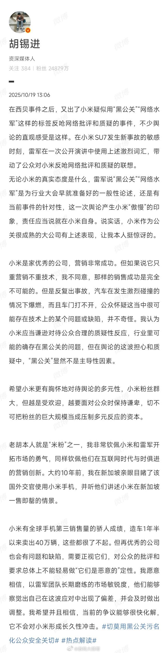 胡锡进谈小米呼吁抵制黑公关和水军