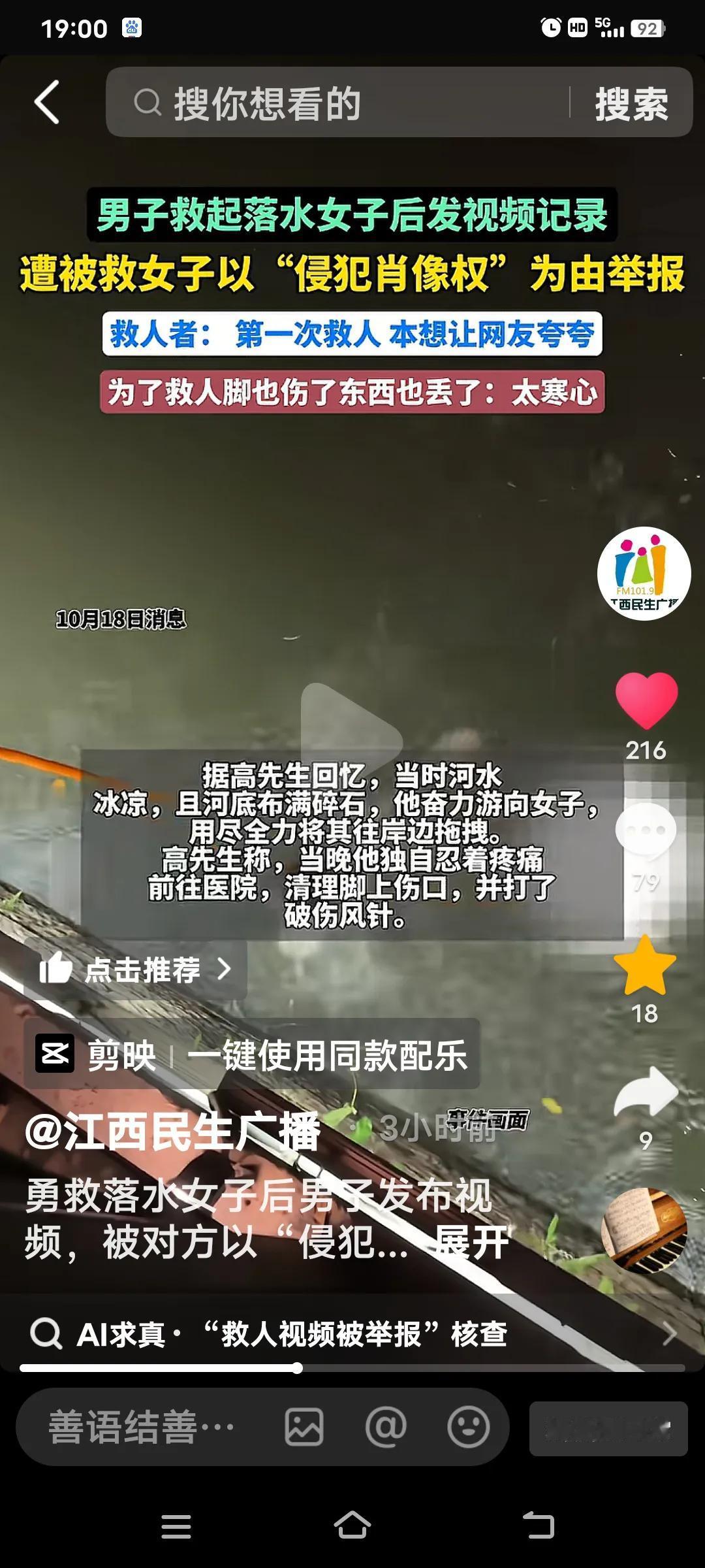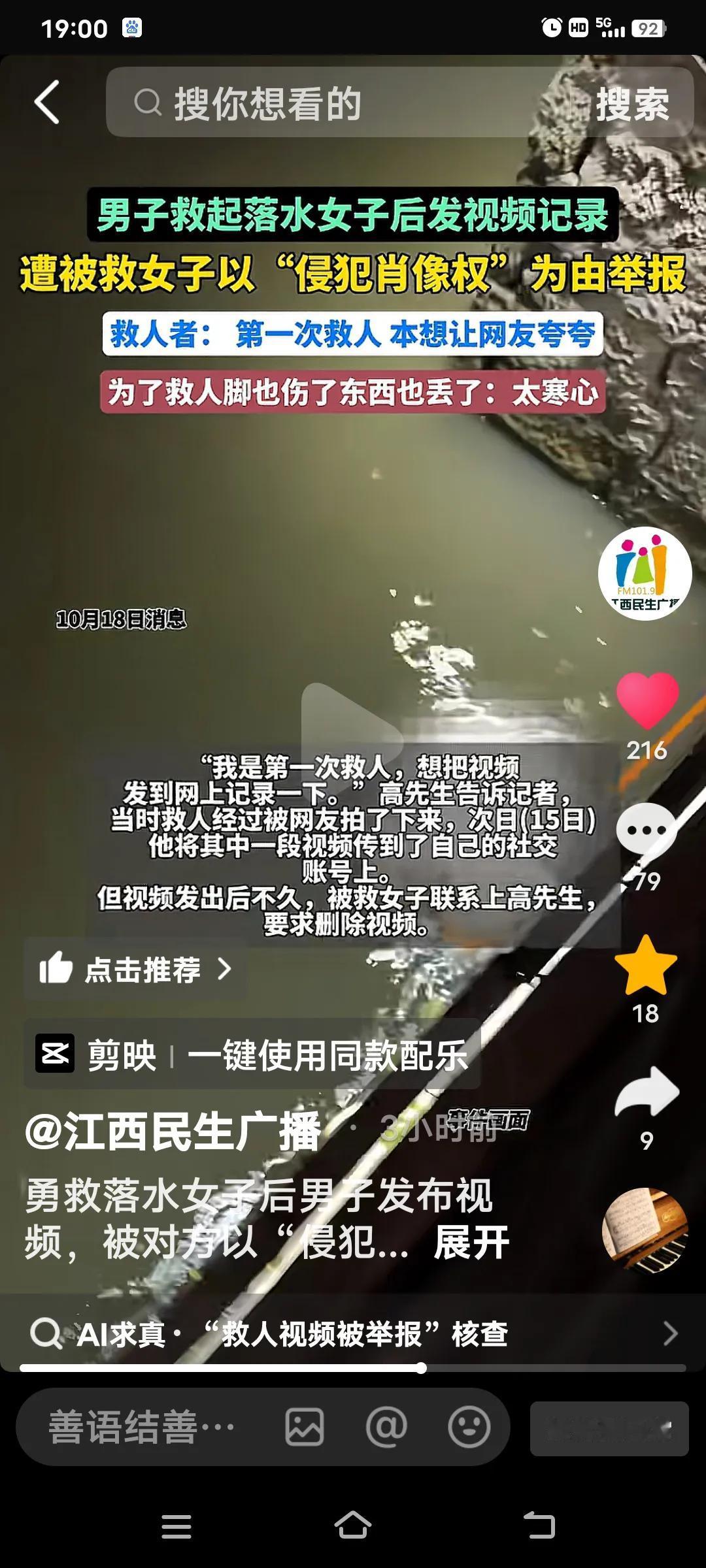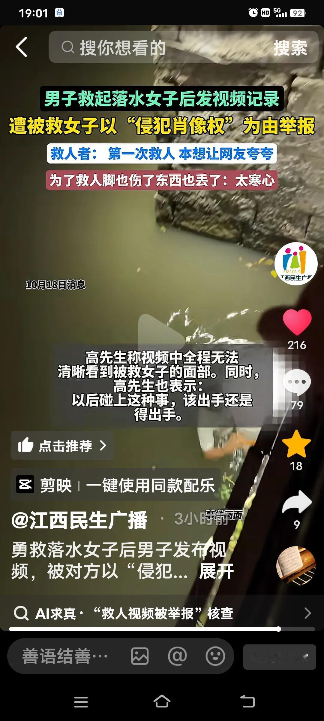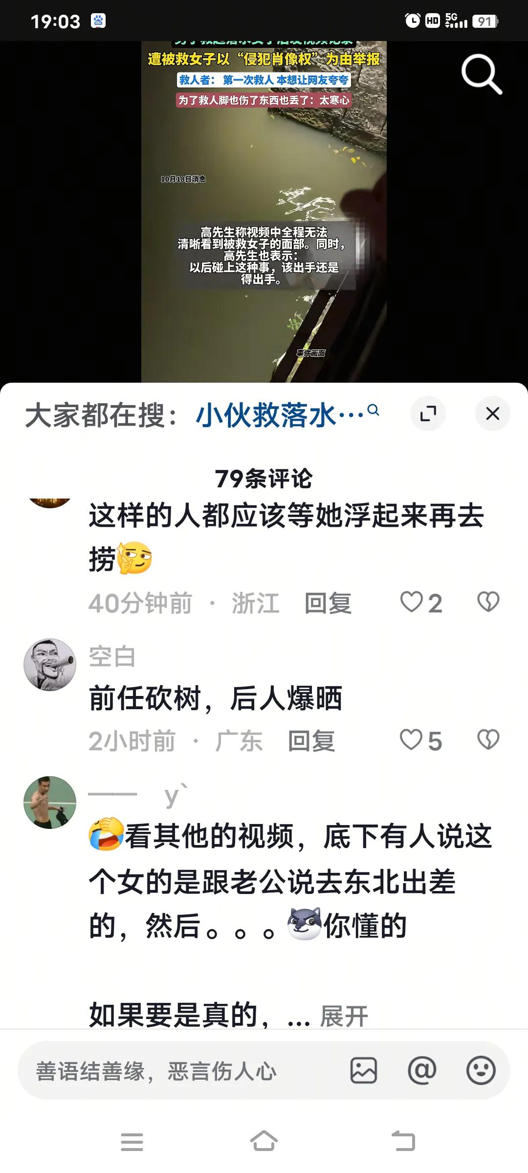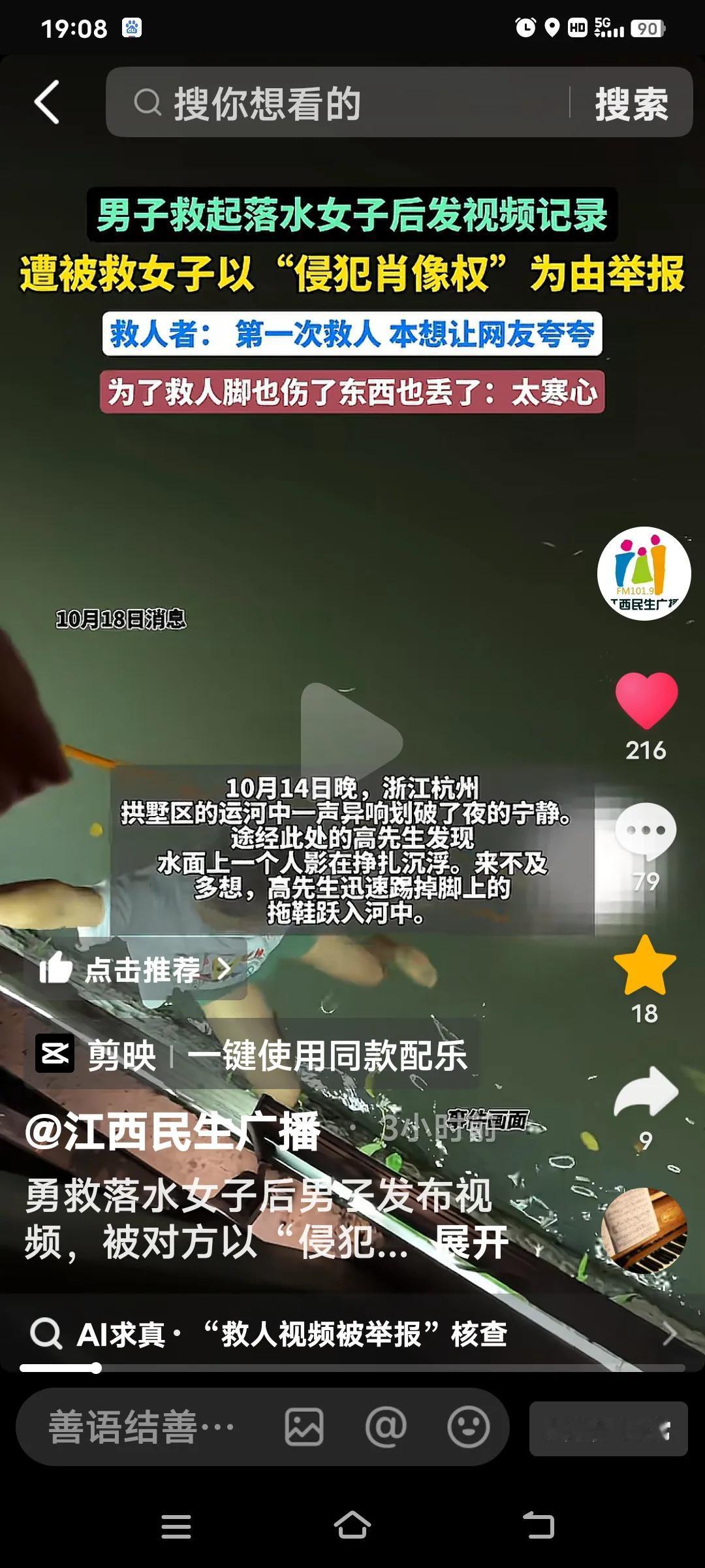 竟有这种事?男子勇救落水女子,反倒被女子以“侵犯肖像权”举报。 10月14日晚,浙江杭州拱墅区的运河中蓦地传来一声巨响。路过此处的高先生瞧见女子落水,情况万分危急,不假思索便纵身跳入水中。 高先生回忆,当时河水冰冷刺骨,他拼尽全力才把女子救上了岸,自己的脚也受了伤,东西也丢了,还去医院清理伤口打了破伤风针。这是他头一回救人,他觉得救人是值得的。 就想把救人的视频发到网上记录一下,高先生告诉记者,此日,(15日)他将救人的一段视频发到自己的社交账号上,本指望能得到大家的赞许,视频发出去不久,落水女竟然联系高先生,并让他删除视频。高先生称,视频里压根看不清女子的脸。这实在是荒唐至极!换作他人,经历这样的事,日后再碰到类似情形还敢出手相救吗? 本是一桩好人好事,却落得如此结局,着实让热心人寒心。 但高先生表示,遇到这种事他依旧会出手相助。此事激起了网友的愤慨,有人说以后女人落水都不救了,有人说等她浮上来再救,也有人呼吁要传递正能量。 更有网友爆料,在另一个视频下面看到,这女孩哄她老公说去广东出差了。怪不得救命恩人没得到她的感激,反倒被要求删除视频,看来有些人真的不值得敬重,感觉高先生理应通过法律向落水女讨个说法。我救你一命,不感恩也就罢了,不该反过来污蔑我呀!是不是这个道理?落水事件 救人女孩 呐喊救人