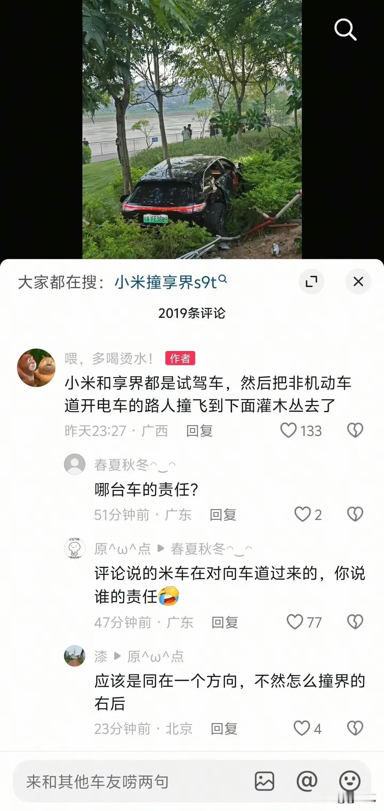 友商相遇格外亲切,小米YU7撞击问界S9致电动车被撞飞,有人严重受伤。事发10月17日,在广西南宁市区某路段,发生一起交通事故,因为涉及热门车型,多家自媒体视频被下架。 据现场群众说,两台车都是4S试驾车,在路上行驶时,小米YU7在一处路口掉头后,享界S9T在前,小米YU7在后面。突然小米YU7加速从后面将享界撞飞出去,在非机动车道上行驶的电瓶车也被撞飞到绿化带。 事发后,120赶来对受伤的电瓶车驾驶员进行了抢救,具体伤亡情况不明,两台事故车也拖离了现场,具体事发原因还在调查中。 小米YU7将享界S9撞飞