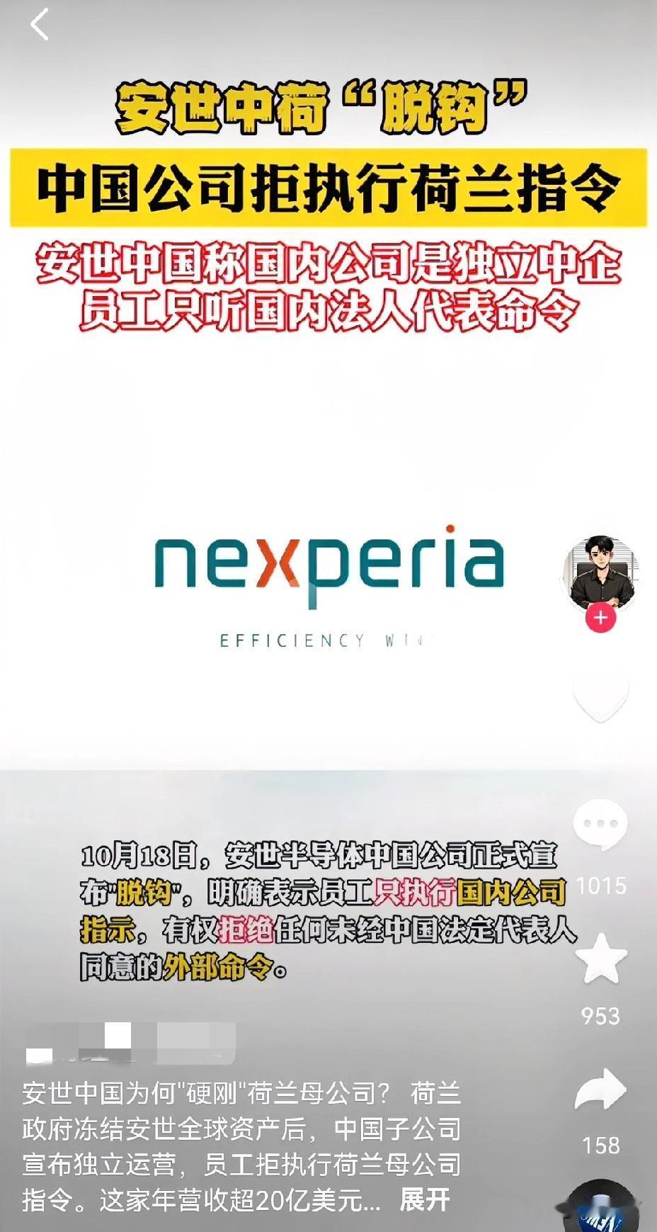 大快人心! 安世中国刚发声明,直接放话,不接受荷兰的任何指令,要自己独立运营! 本来生产的大头70%都在国内,荷兰费半天劲就抢了个办公室,这不是闹笑话嘛! 要我说,闻泰科技真应该这么做:一是把荷兰的安世总部撤了,在中国建个新安世总部,把荷兰的外籍高层全开除;二是按公司法,去总公司所在的中国法院,告荷兰政府这抢劫行为!