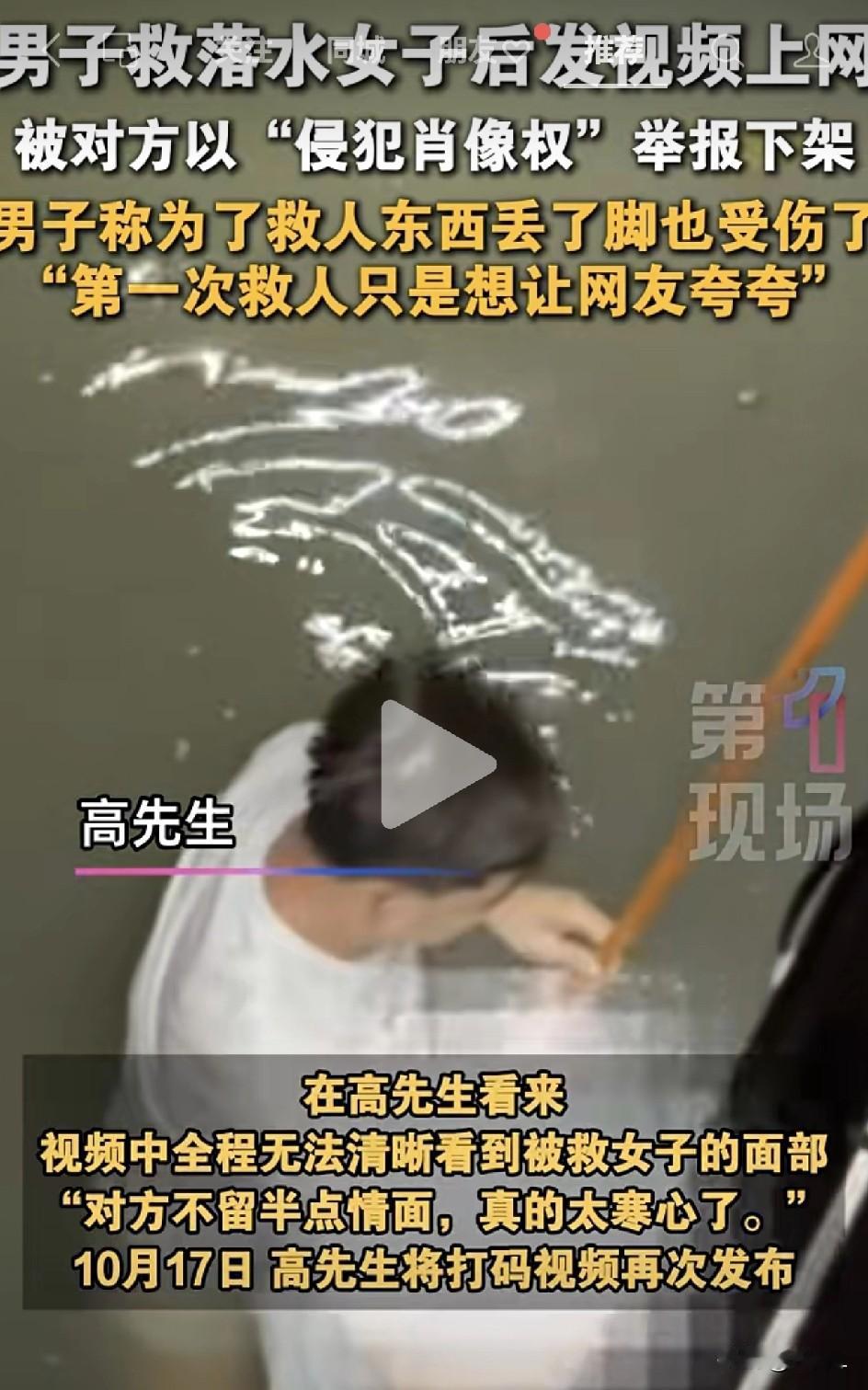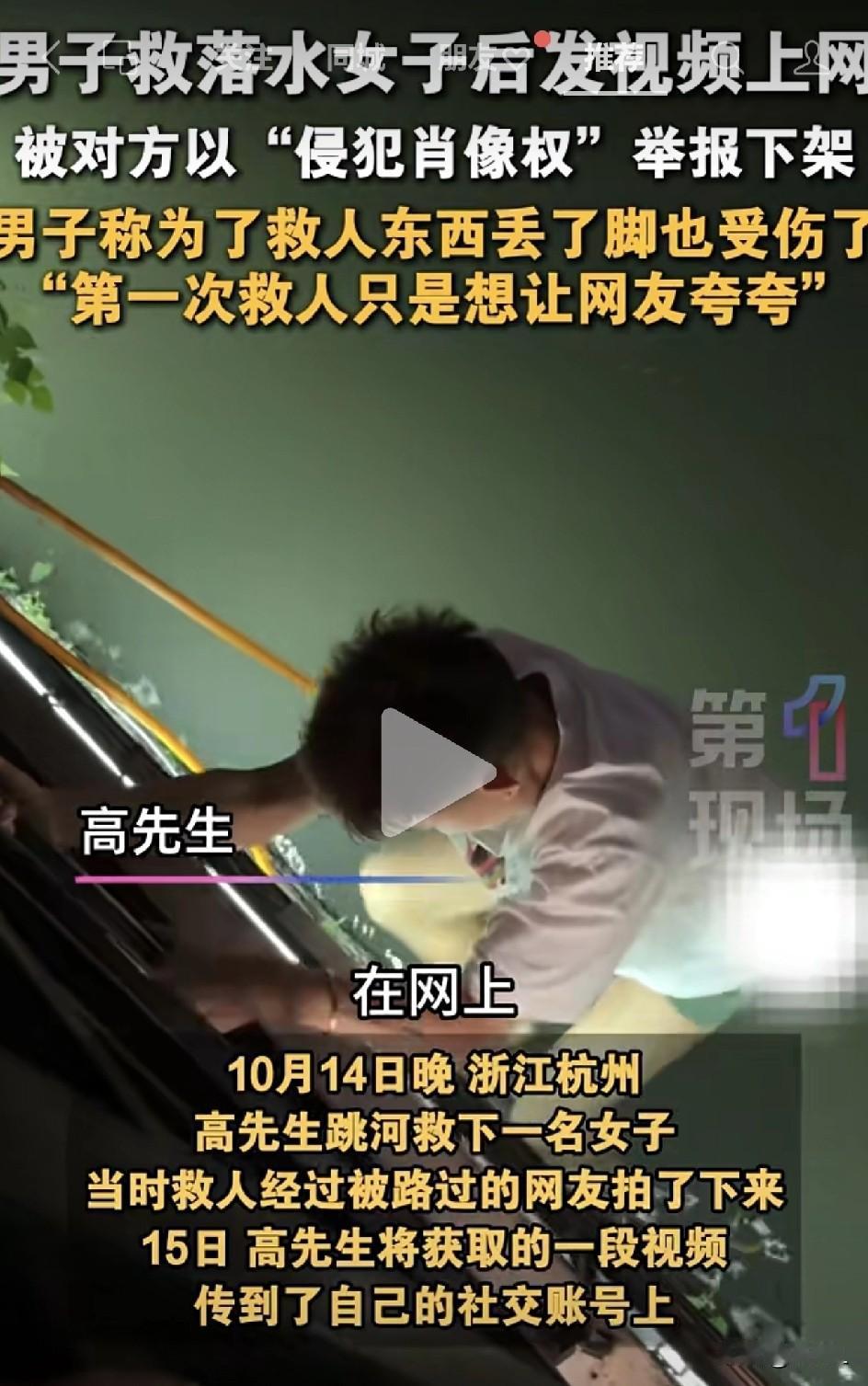 救人后发视频“求表扬”,反被落水者举报下架!救人者:寒心,但下次还救!网友炸锅:究竟是谁凉了英雄的心? 10月14日,高先生路过浙江杭州拱墅区运河时,发现一名女子落水。高先生来不及多想,直接跳下水去救人。 河底布满了碎石,划伤了他的脚。忍着痛将女子拖至岸边,然后独自就医处理脚部伤口并注射破伤风针。 第二天,高先生把网友拍摄的救人视频,截取了一小段上传到社交平台,希望记录自己的善举,得到广大网友的称赞。 没想到,高先生同时等来的还有被救女士的追责,要求高先生下架视频。 高先生还在犹豫时,直接收到了平台的强制下架通知,被救女士以高先生侵犯了她的肖像权为由向平台举报,平台做出了强制下架的决定。 高先生觉着自己很委屈,自己只是想记录自己的善举,向网友们求表扬。视频中的女士面部根本不清晰,对于女士的举报,高先生表示非常寒心。 网友们也是争论不休: “小伙子没做错,这样的人就不应该救!” “每个人都有自己的命运,以后不要随意干涉他人命运。” “没事,善良不会被辜负,一样是积德。” “说实话,发视频不打码,确实不合适。” “如果是我,我会对救我的人感恩戴德,但不打码的视频,我也接受不了。” 女士要求的“肖像权”,也是人之常情,发视频的时候,应该做出打码处理。在这一点上,高先生做的确实欠妥。 但高先生救人在前,女士没有任何的感谢表示,本就让人心凉。事后因为视频,自己有意见,可以跟高先生好好协商,直接举报,确实寒人心。 虽然心寒,但高先生依然表示,自己将来再遇到类似的事情,该出手时还是会出手! 同时,高先生将视频打码以后,重新上传到社交平台。 虽然在肖像权上高先生的举动确实考虑不周,但这并不能抹杀他的善举。 见义勇为,施恩不求回报,独自处理伤口,更是在被被救人举报后,依然初心不改,坚持自己的与人为善之路。 不能寒了英雄的心!英雄们挺身而出的勇气值得全社会的守护和传承! 信息来源于第一现场,侵联删!