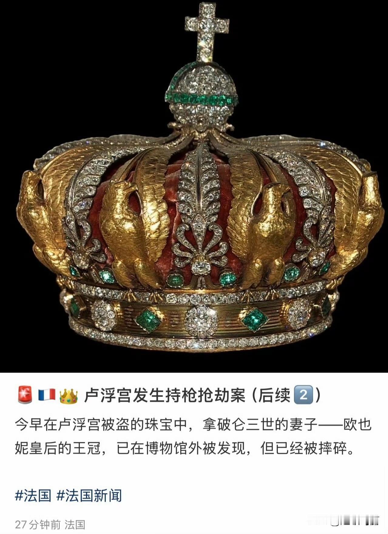 真的好漂亮的首饰,居然被盗了卢浮宫被盗过程仅7分钟 劫匪竟然只是用了一把梯子就闯入了卢浮宫,盗走了几件无价的珍宝。 他们是从塞纳河一侧进入的——那一带正在施工,监控较少。劫匪爬上一楼的一扇窗户,用电锯将窗户切开后进入馆内。 进入后,他们直奔阿波罗长廊(Galerie Apollon),用电锯切开两扇展示柜,洗劫了“拿破仑珠宝”和“君主珠宝”两个系列的藏品。