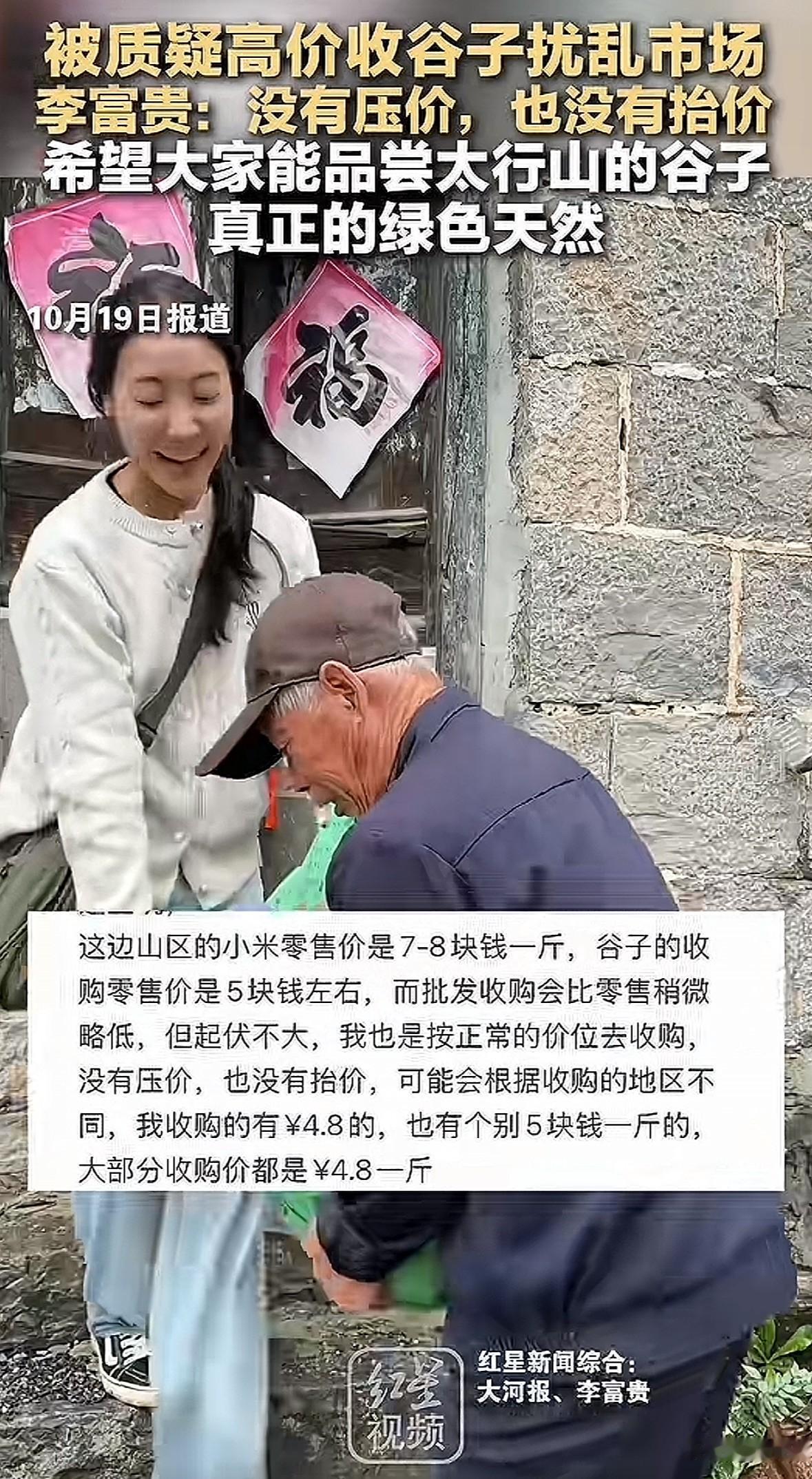 网红李富贵收带壳谷子,价格4.8元/斤,个别地区5元/斤,比市场均价2.5元/斤高出近一倍,被质疑扰乱市场。 她回应说没压价也没抬价,山区小米零售价7-8元/斤,谷子零售收购价本就5元左右。她收的是谷子,省去村民加工、运下山的麻烦。网上三四块的收购价是大规模收购的批发价,山区是小家庭种植,靠零售,品质也好,价格自然高些。 其实这和那些摆拍卖惨、虚假助农的不一样,她是真给村民省了事、多赚了钱。农户能得实惠,品质好的农产品也有销路,这不叫扰乱市场,反而让助农有了实在模样。比起虚假套路,这种真诚帮扶才该被认可。