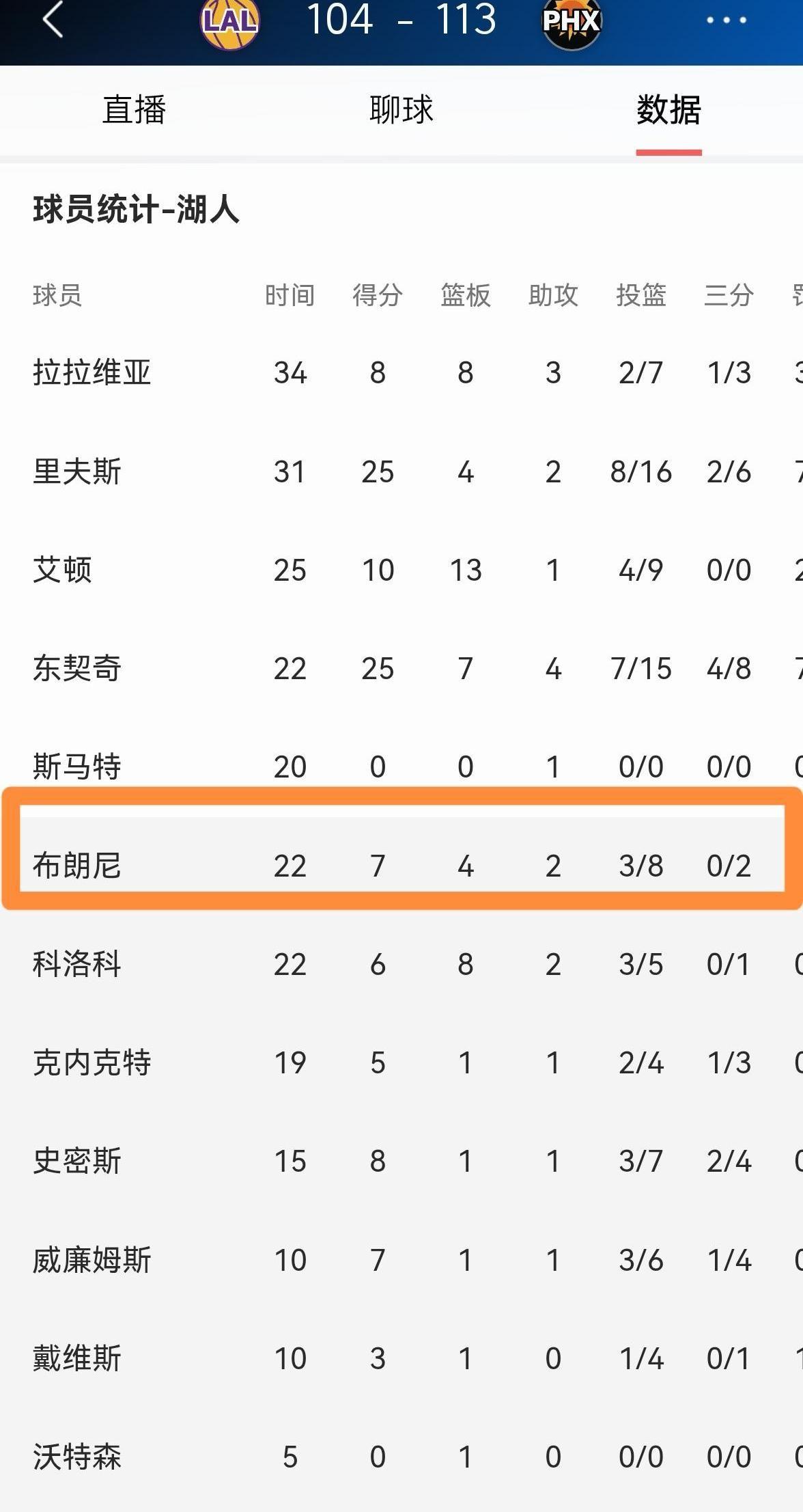 湖人太子爷布朗尼,交出了-24的成绩单。 这个数字,比他那7分4篮板的数据,还要刺眼一百倍。 全队最低,简直是断崖式的垫底。 对阵太阳的季前赛,布朗尼替补打了22分钟,8次出手只换来7分,效率确实有点拿不出手。更要命的是,他在场上的这段时间,湖人队被太阳队狠狠地赢了24分。这可不是什么小差距,这几乎等于说,只要他一上场,球队的防线和进攻就集体掉线。 很多人都觉得,他能进湖人,靠的不是实力,而是他爹詹姆斯的名气。现在这份数据,不就是把这种质疑给坐实了吗?篮球场上终究是靠实力说话,顶着再大的光环,打不出表现,也只会成为对手的突破口。 湖人管理层现在估计头疼得很。一边是篮球之神的儿子,面子得给足;另一边是球队的战绩,输球可不行。这种“父子篮球”的梦想,听起来很美好,可一旦儿子的表现拖了球队后腿,那就会变成全队的噩梦。 你觉得湖人应该继续给他机会,还是让他去发展联盟练练级?
