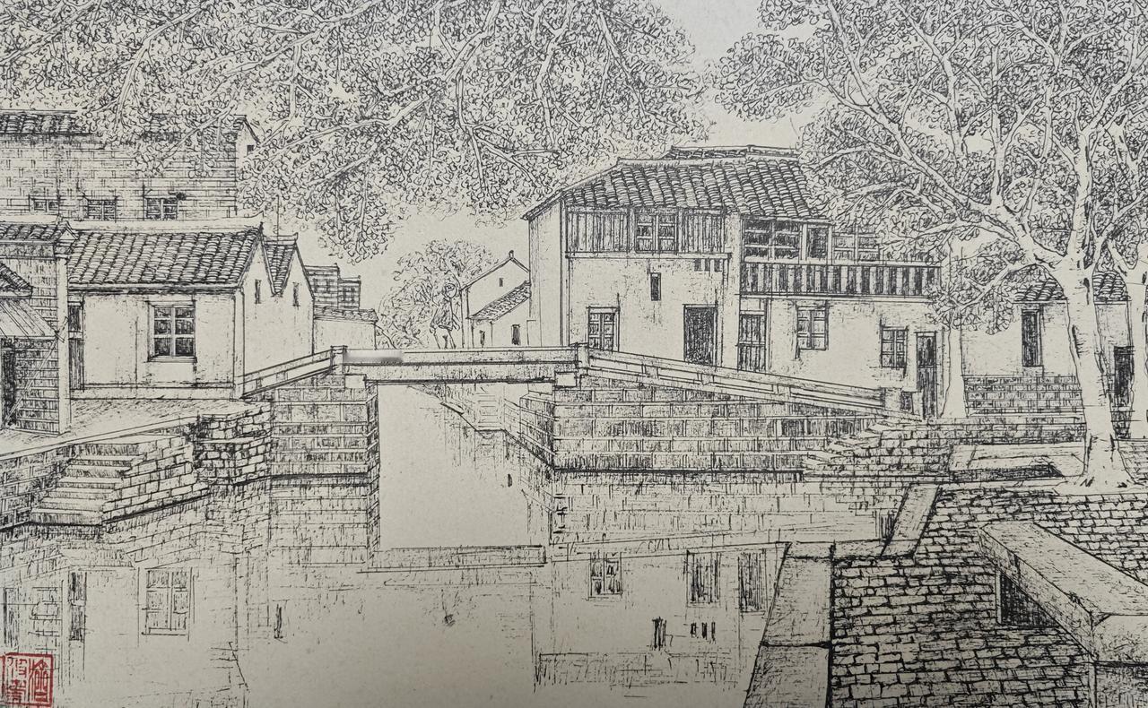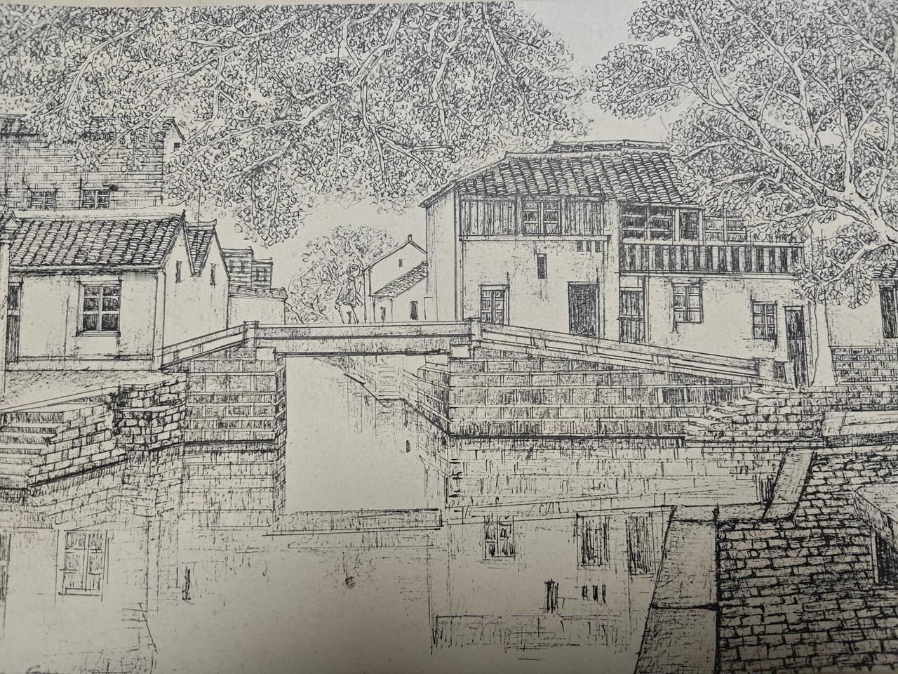 大约20年前画的一幅画,纸张已经泛黄,倒反而多了一些江南古镇的味道。这是用极细的签字笔线描而成,画这样一幅画,至少需要六到八个小时,那个时候年轻,但真的有耐心啊。寒暑假画了不少的画,现在,已经完全没有灵感,也没有精力画这样的画了。绘画 艺术 【4只笔+墨水共5件套】自带笔锋秀丽笔软大中小楷极细写生素描练字