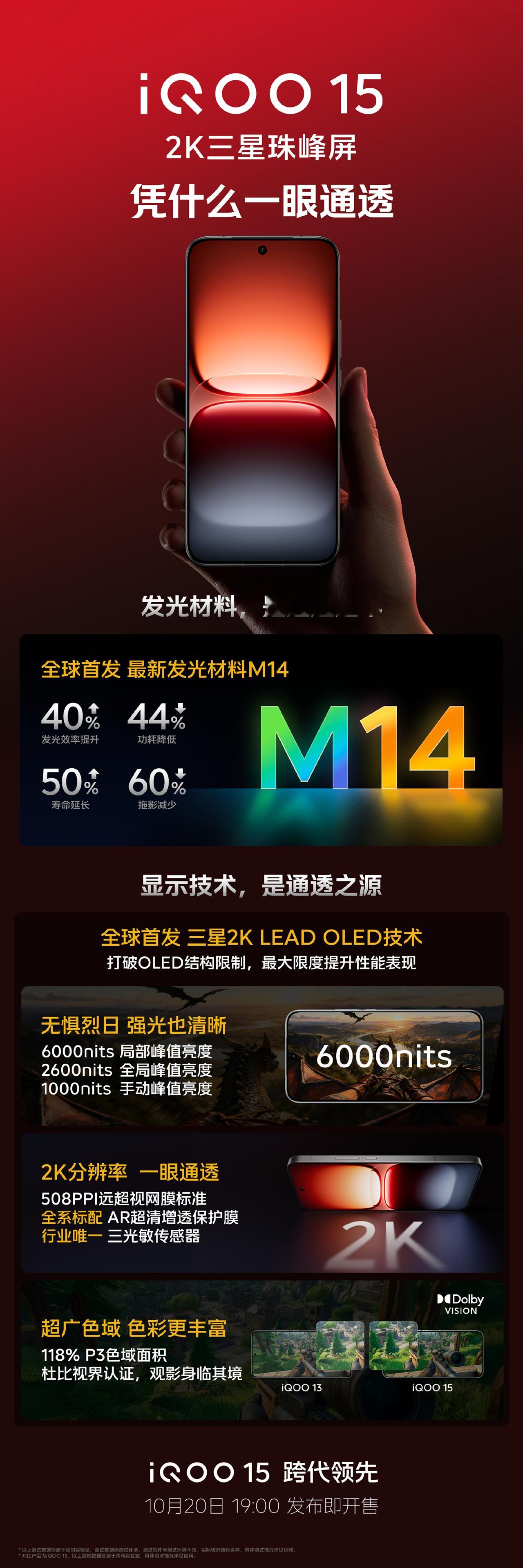 这次iQOO 15的性能是真的强。第五代骁龙8至尊版配上行业唯一实现「全场景光追+游戏超分+游戏超帧」于一体的Q3独立显示芯片,硬件级2K+144的游戏体验无人能敌,堪称电竞之王!甚至于还带来了首个落地的手游自研全场景光追,让虚拟世界更加接近物理世界,沉浸感更足。这样才不辜负这块行业最好、最贵的真2K三星LEAD OLED屏幕,全新M14基材全局峰值能怼到2600nits非常离谱,重点是一眼通透,观感足够的好。影像上也有出乎预料的增强,全5000万像素影像系统配上旗舰影像算法,你真的可以相信蓝厂影像。那么明天晚上19点,我们一起看iQOO 15!