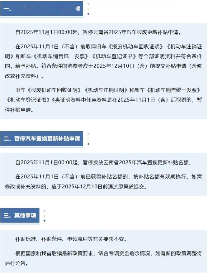 10月19日消息,云南省商务厅发布公告,宣布根据消费品以旧换新有关政策要求和云南省专项资金安排及使用情况,现将暂停2025年云南省汽车报废更新、汽车置换更新补贴申请有关事项。 据此前报道,海南省商务厅10月4日发布《关于进一步调整 2025 年商务领域消费品以旧换新政策有关事项的公告》提到,自2025年10月6日0 时起暂停2025年海南省汽车置换更新补贴政策。 另外,杭州市商务局也在9月30日发布《关于进一步调整 2025 年杭州市汽车以旧换新政策的公告》,自2025年10月9日0时起,在杭州市范围内暂停实施汽车置换更新补贴政策。【来自懂车帝车友圈】