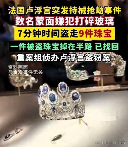 万万没想到,卢浮宫“破防”被盗, 巴黎治安真的安全吗? 当地时间10月19日,巴黎卢浮宫发生一起被盗案,四名嫌疑人潜入卢浮宫内部,盗走“拿破仑珠宝”等价值3000欧元(约合人民币2.3万元)的珠宝后逃离。 几个嫌疑人使用货运电梯潜入卢浮宫内部,随后使用电锯撬开窗户,盗走“拿破仑珠宝”等一批珠宝后骑摩托车逃离现场,卢浮宫随即关闭,并报警处理。 警方后来查出, 这伙人早踩过点,连施工区的升降机都算好了,7分钟就搞定,连“摄政王钻石”都没碰,专挑好带的珠宝下手,够精的。 更巧的是, 现在已经找回两件珠宝,据说是劫匪骑摩托逃跑时太慌张,把皇后的王冠给遗落了,真是偷鸡不成还丢了“皇冠”。 马克龙全程盯着这事儿, 内政部长都承认,卢浮宫的安保就是个漏洞,连世界级博物馆都防不住,其他地方更悬。 这事儿不光是丢了几件珠宝, 更打了法国文化安保的脸。再牛的艺术殿堂,没把安保做到位,也只能给劫匪当“提款机”,后续要是不补漏洞,指不定还出啥乱子。 总结一下 今日卢浮宫这安保跟闹着玩似的,4人用电锯破窗7分钟得手,还骑摩托溜了,还好找回的王冠。不过这事有点搞笑,世界级别博物馆被劫,还赶在《蒙娜丽莎》被盗百年纪念月,这剧情比电影还离谱,安保漏洞也太明显了。 该事件发生后,引发了人们对巴黎安全的担忧,你觉得巴黎治安真的安全吗? 卢浮宫