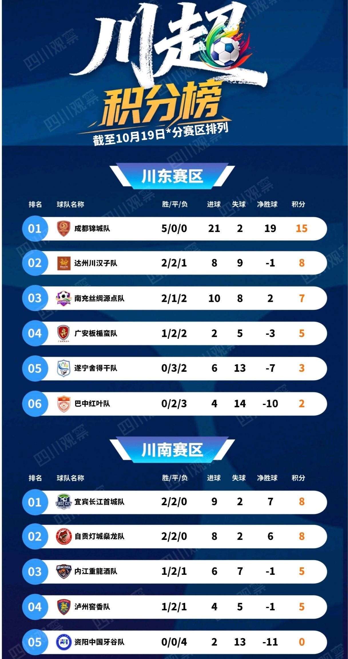 虎扑10月19日讯四川省城市足球联赛今日再战5场,广安1-0巴中,南充1-3成都,达州2-1遂宁,眉山1-0攀枝花,凉山5-0雅安。最新积分榜如下: