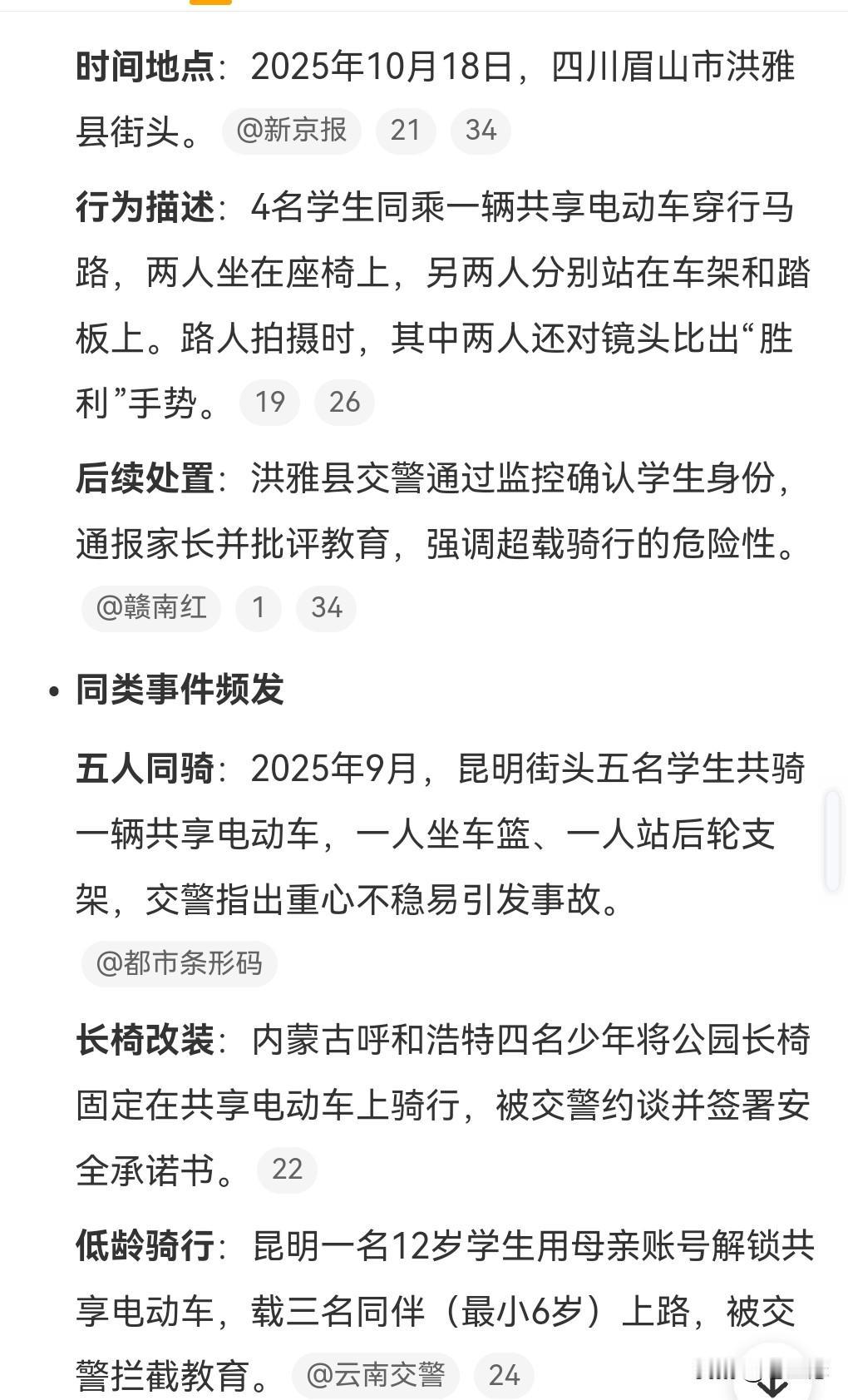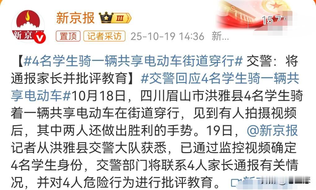这真是有点无知无畏了。太不把安全当回事了。 生活中有些骑共享电动车的,看见过两人骑一辆的,也看见过三人骑一辆的。 大多数是发生在未成年学生之间。 没想到这次开了眼了。 10月18日,四川4名学生骑一辆共享电动车街道穿行,而且速度还很快,不知道驾驶人是怎么看清前方的,有两人见到别人拍摄后做出V字型胜利的手势。 这真的是有点虚荣。