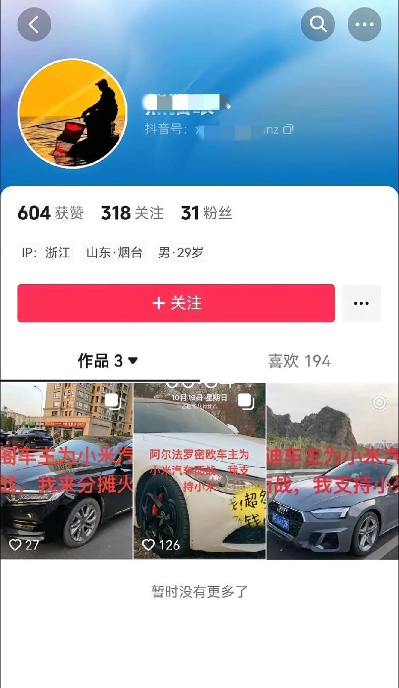 网上看到的一张截图:粉丝数量仅有几十个的这么一个账号,发布了三个视频,分别是雅阁车主、阿尔法罗密欧车主、奥迪车主“为小米汽车而战,我来分摊火力”…… 我也是服了这批人,阿尔法罗密欧都整出来了! 如果说真的是小米车主,他们发“为小米分摊火力”的视频,还勉强说的通哦,毕竟人家开在路上不愿意被路人喊“ds车”、“绿化带之王”、“五菱神车”。可这些账号什么意思呢?义务劳动,我是打死都不信的!在我看来,这种账号的唯一作用就是忽悠真正的小米车主跟他们一样“为小米分摊火力”,而很多小米车主还真的会上当,如法炮制发个一模一样的文案! 不知道我这样的猜测对是不对?