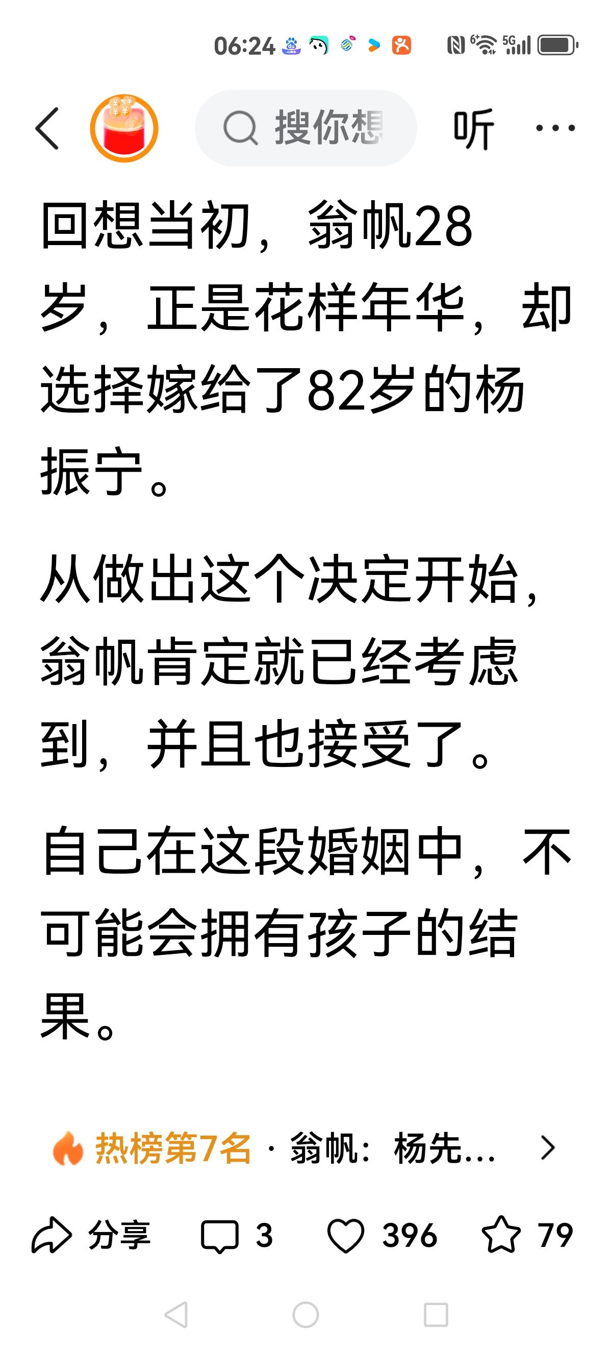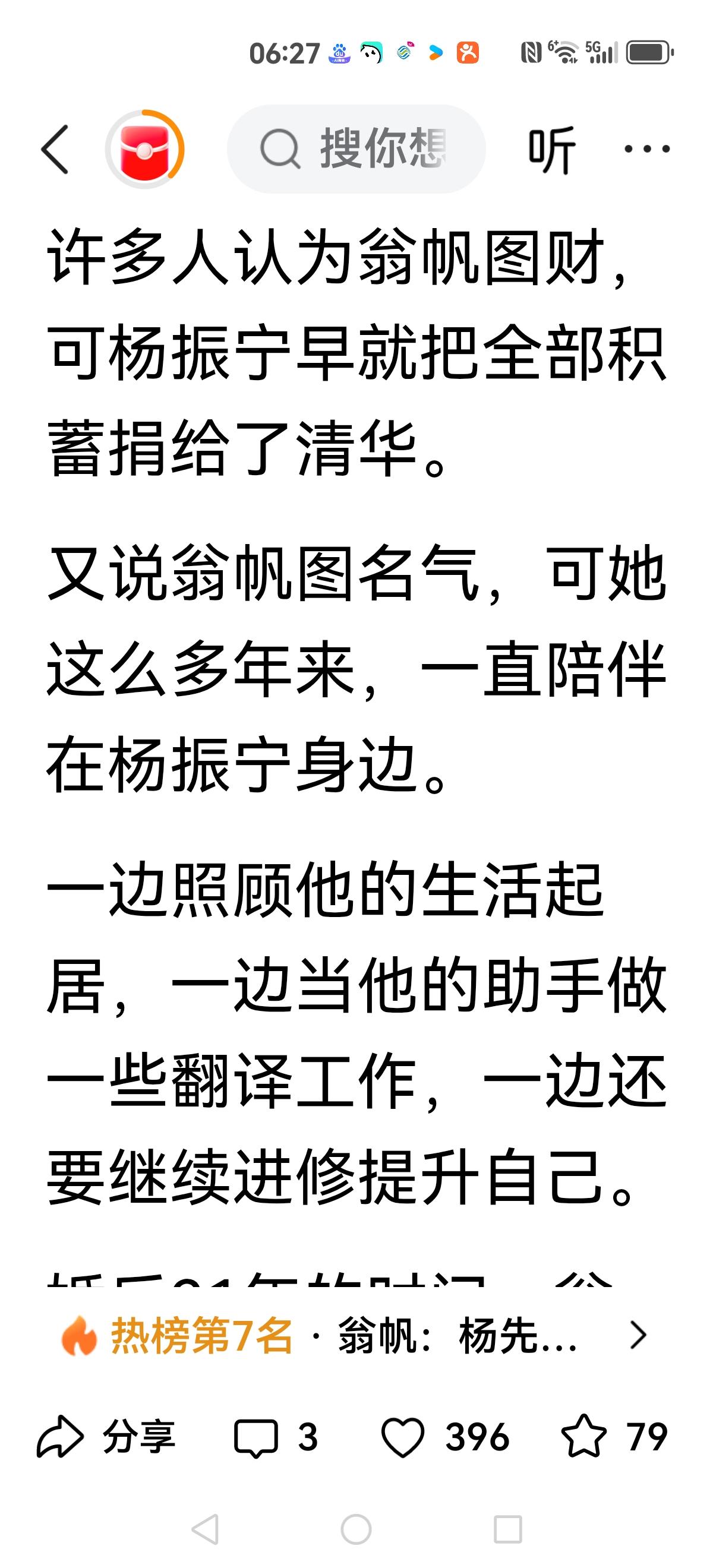 【翁帆差一年退休】 28岁翁帆嫁给82岁杨振宁 21年相濡以沫,如今49岁翁帆,杨振宁走了 差一年退休的翁帆,继续拥有那套别墅,而钱财来说杨振宁几乎捐给母校。 有人一直在问翁帆到底图什么? 殊不知翁帆就是想清净,与世无争的世外桃源,不是所谓财产,而是一种远离尘嚣的宁静。 正是杨振宁带给翁帆这份宁静,她照顾老人家,不需要考虑财米油盐酱醋茶,简单简单无忧无虑的生活。 有人看不懂翁帆的心底,其实从第一次婚姻就能看出。