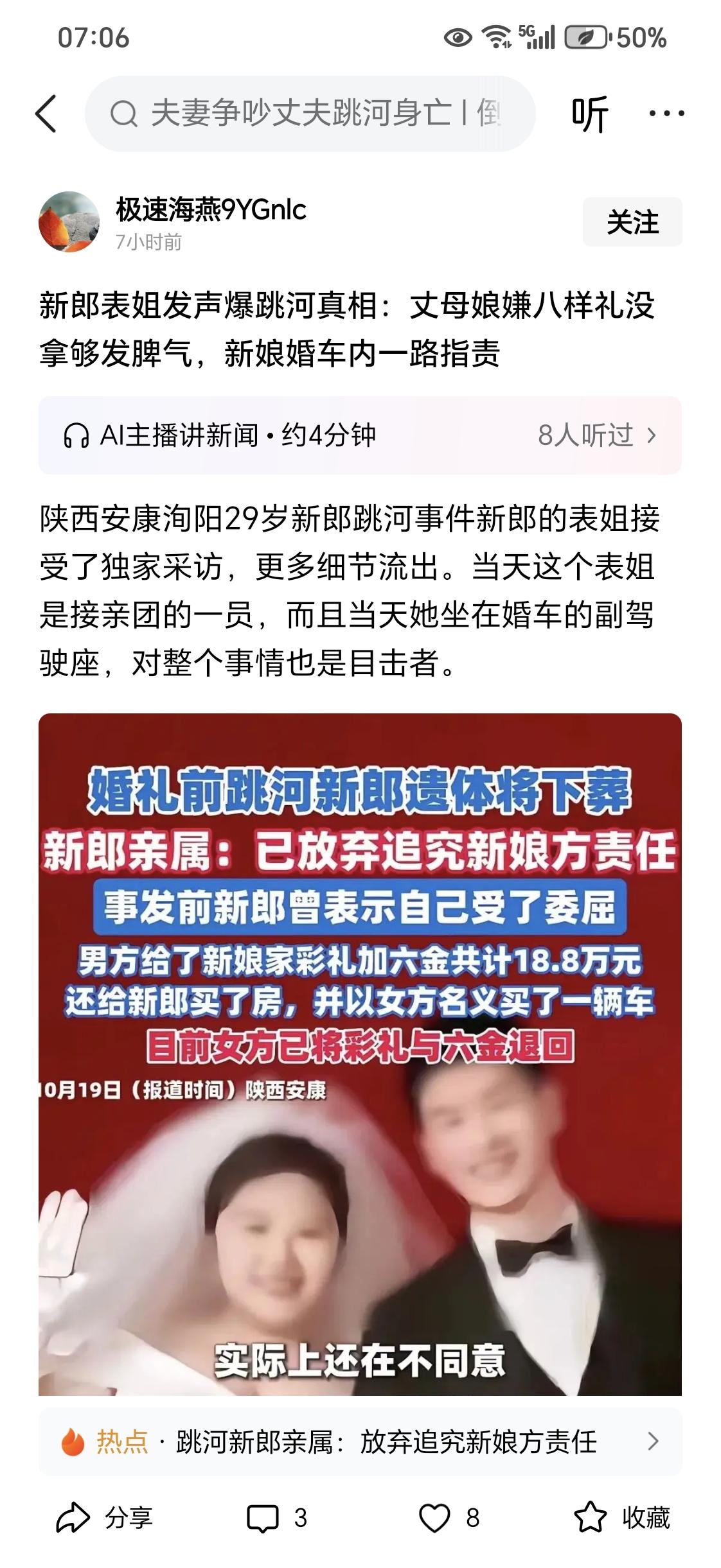18.8万彩礼+新房+女方名义的车+漫长的拉锯+女方一家毫不顾及男方尊严的PUA。这样走了,也徒留悲伤给父母,毫无意义,极不负责。男人要有骨气,更要有勇气说no。