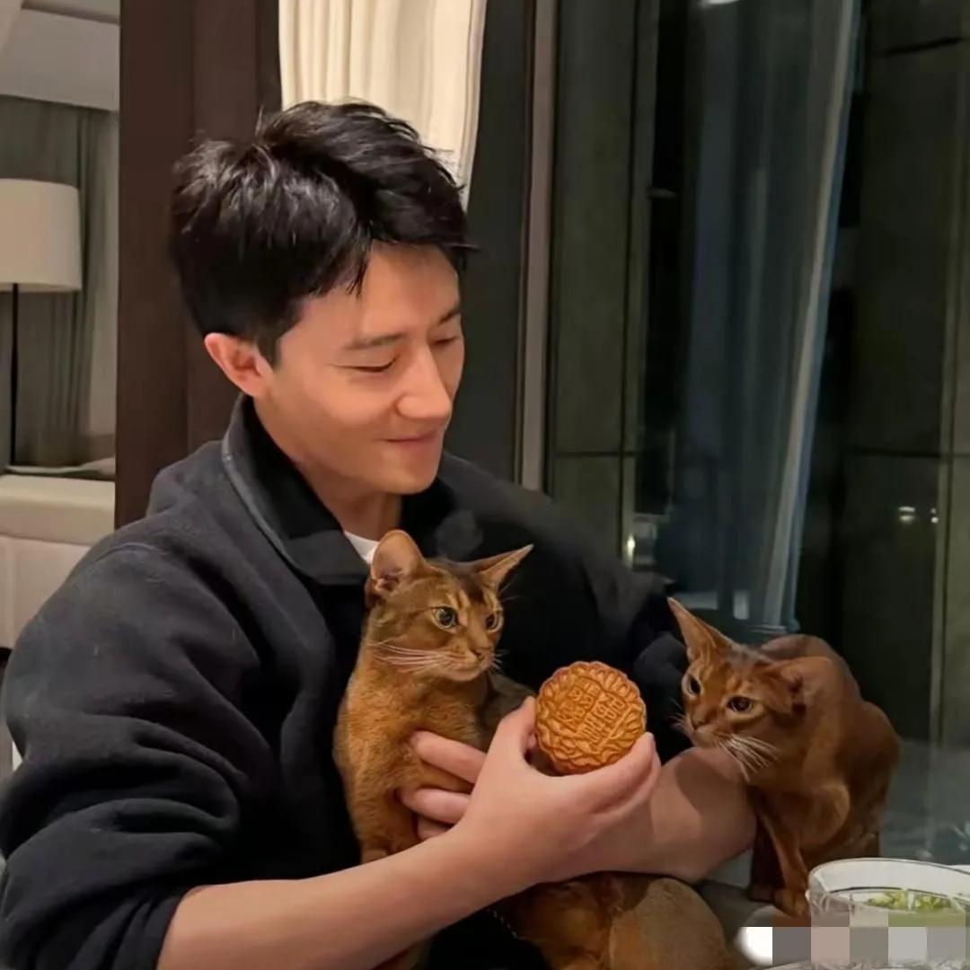 黄轩与爱猫合照:画面中的黄轩气色盈和,疏眉朗目,鼻似秀峰,年轻帅气;两只猫咪看上