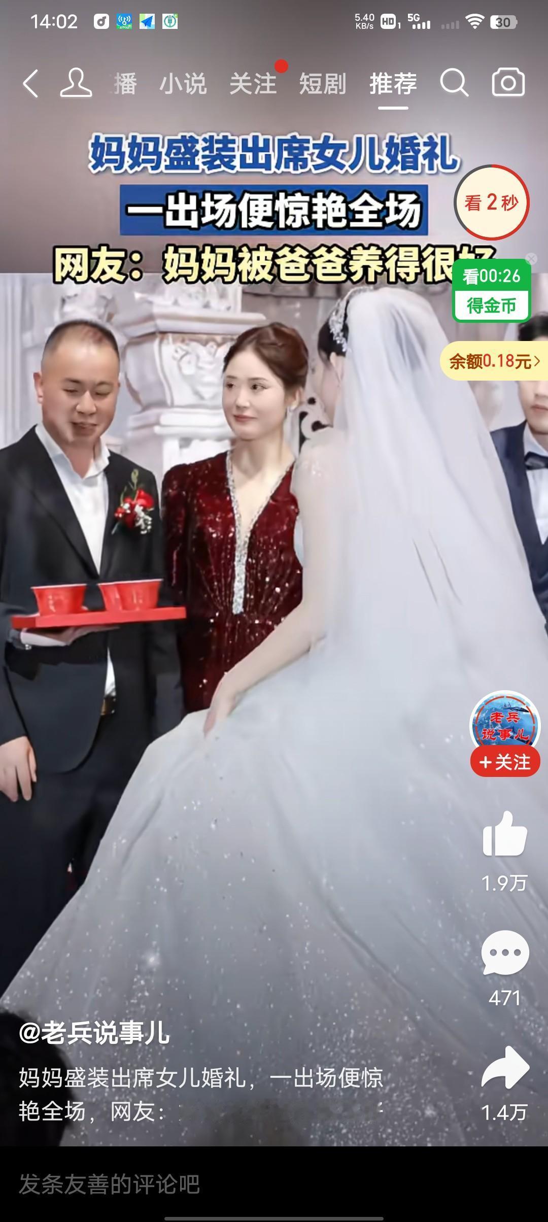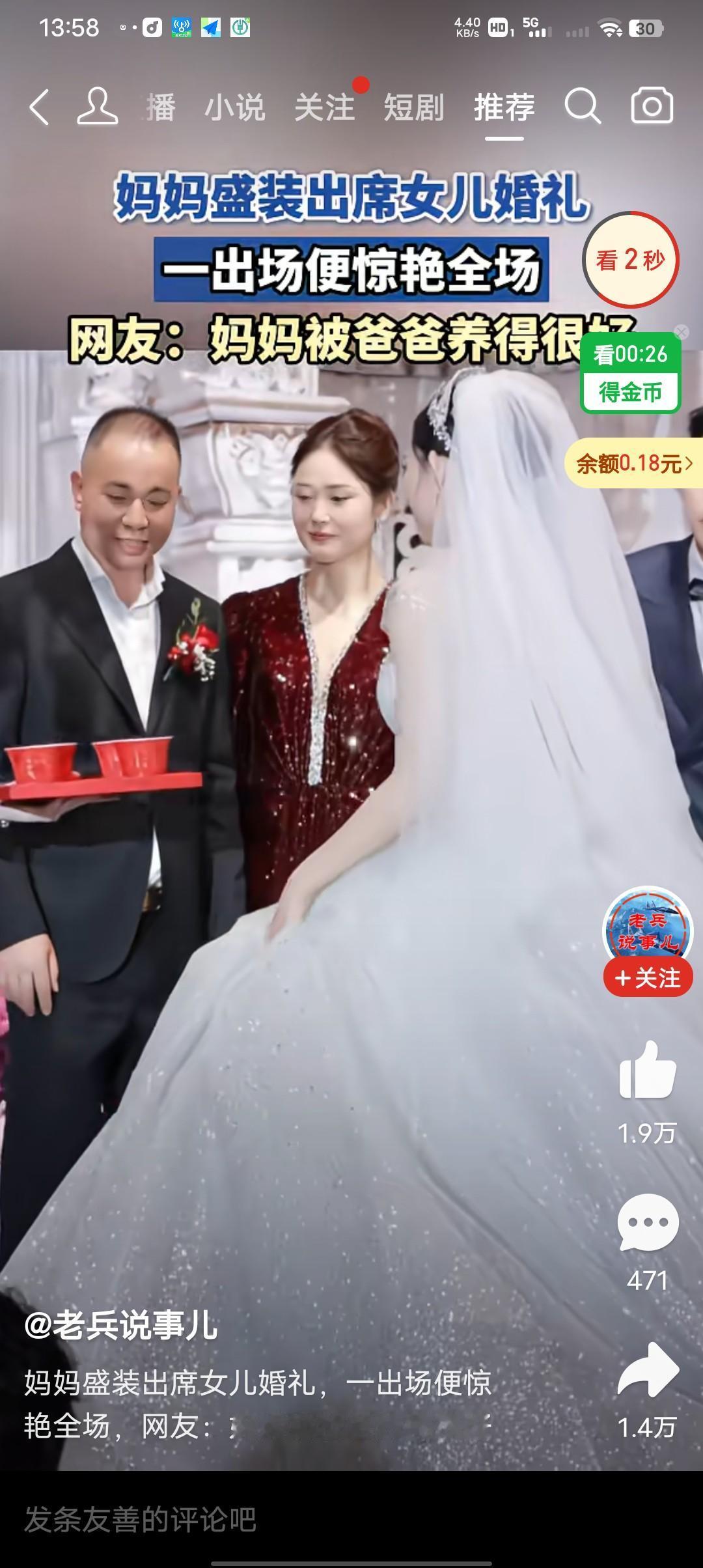 爱一个人的时候,眼神骗不了人你信不信? 妈妈盛装出席女儿的婚礼,一出场就惊艳全场。妈妈挽着爸爸的胳膊缓缓走来,妈妈真的很漂亮,有网友说,妈妈被爸爸养的真好。可我细心的网友说,这绝对不是亲妈,因为这个妈妈自始至终都没有一个眼神落到女儿身上过。请问有哪个妈妈在女儿一辈子最美丽的时刻,不是满满的自豪,那爱的眼神你拉都拉不开吧!可这位妈妈的眼神很疏离,感觉好像是参加别人的婚礼,而不是自己女儿一样。 是,爱眼神骗不了人的,爱是自然而然的释放出来的,不是刻意的装出来的。也许爸爸还是疼爱女儿的吧,因为看到了爸爸脸上的笑容,就是不知道能坚持几分真呢!