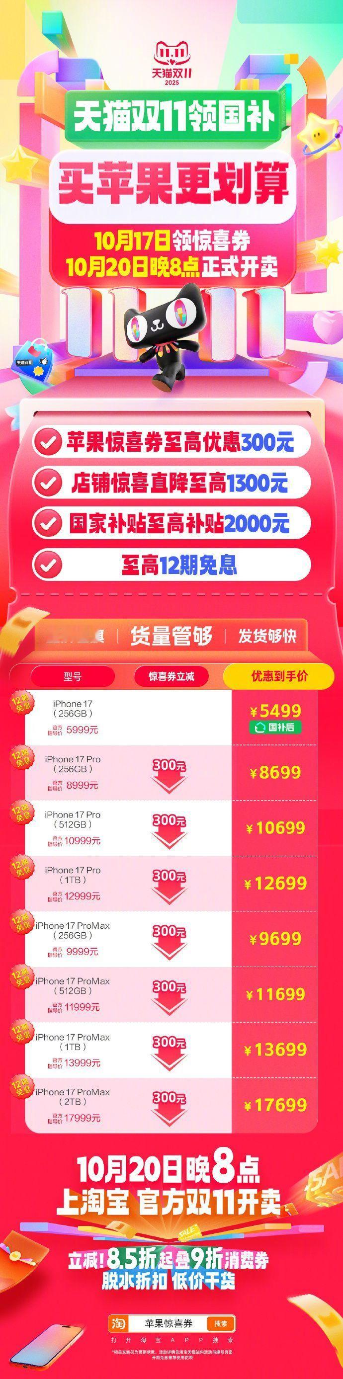 iPhone17pro天猫官旗首次降价10月17日,天猫Apple Store官方旗舰店公布双11优惠。10月17日可领惊喜券,10月20日晚8点iPhone 17 Pro系列现货开卖,优惠300元。官旗策略显示,iPhone、iPad等系列产品均有折扣。iPhone 17 Pro系列可用300元惊喜券,享至高12期免息。非iPhone产品可用50 - 100元惊喜券,还能叠加四重优惠。活动期间,iPhone 17 Pro系列到手价低至8699元起。iPad Air 11到手价低至3099元,AirPods 4约679元。店铺还提供12期免息、以旧换新服务。