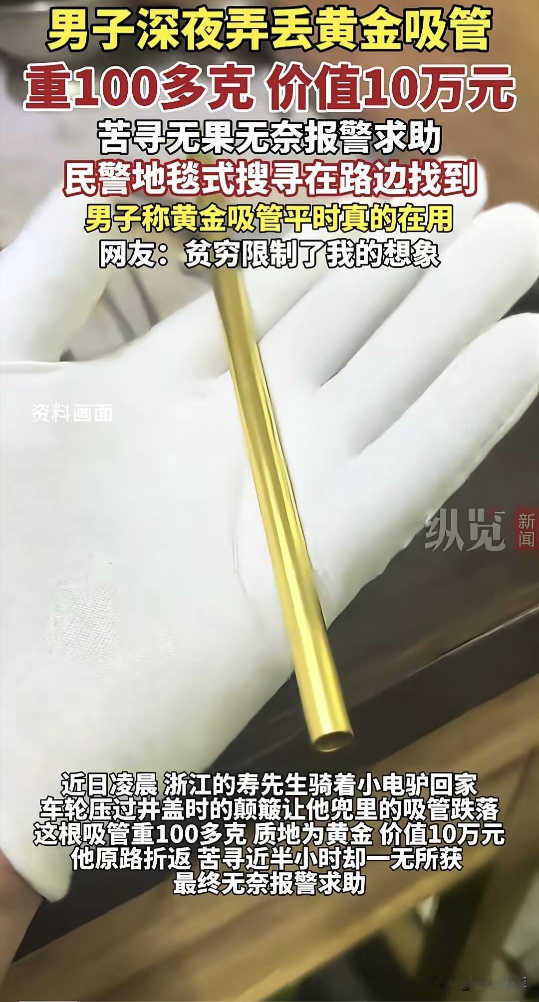 男子喜欢喝奶茶,就用100克黄金打造了一根金吸管,专门用来喝奶茶,价值10万,结果骑电动车时颠掉了,报警求助民警才找回来。网友:这吸管掉地上也没人相信是黄金做的。 浙江,男子平时喝奶茶就把这根黄金吸管揣兜里带着用,当天晚上,他骑电动车回家,路过一个井盖时,车颠了一下,揣在兜里的金吸管直接飞出去了。 他发现吸管丢了,赶紧回头去找,但找了半个多小时也没找到,情急之下报了警。 民警来了之后,在吸管掉落的井盖附近一点点搜,判断金管子沉,又是圆的,肯定会滚远,于是扩大了搜索范围,最后在离井盖不到100米的路边石缝里找到了。 黄金吸管虽然找回来了,但掉在地上磕得坑坑洼洼的,男子觉得不美观,打算把它融了,等明年夏天再重新打一根新的,接着用它喝奶茶。 有网友觉得男子用10万黄金打造吸管是浪费钱,是炫富行为,这些钱可以做更有意义的事情。 也有网友觉得男子花自己的钱,满足个人爱好,无可厚非,只要不影响他人,就应该被尊重。 不管丢的是金吸管还是普通东西,民警都这么上心,说明很重视群众,认真又负责,这才是最值得夸赞的点。