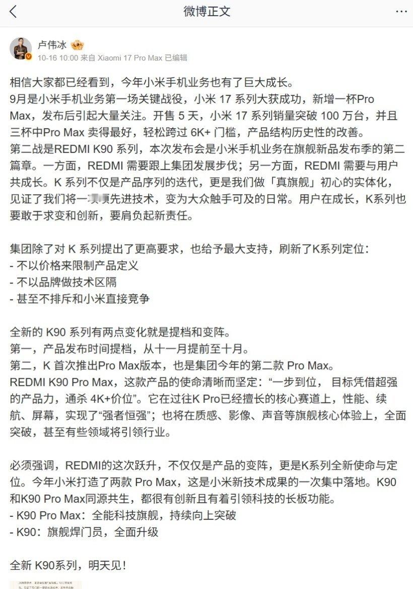 目前小米官方暂未开启 REDMI K90 标准版机型的预热,但据此前报道,小米集团合伙人、总裁、手机部总裁、小米品牌总经理卢伟冰曾发文表示,REDMI K90 系列是小米手机业务在旗舰新品发布季的第二篇章,同时 K 系列的定位刷新: