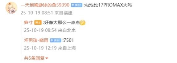 有用户询问新机价格会不会大涨,笋寸表示“大... 小... 涨吧”。另外,还有用户询问 REDMI K90 Pro Max 的电池容量是否比小米 17 Pro Max 大,笋寸回复“好像大那么一点点”,这也意味着 REDMI K90 Pro Max 的电池容量将大于 7500mAh。
