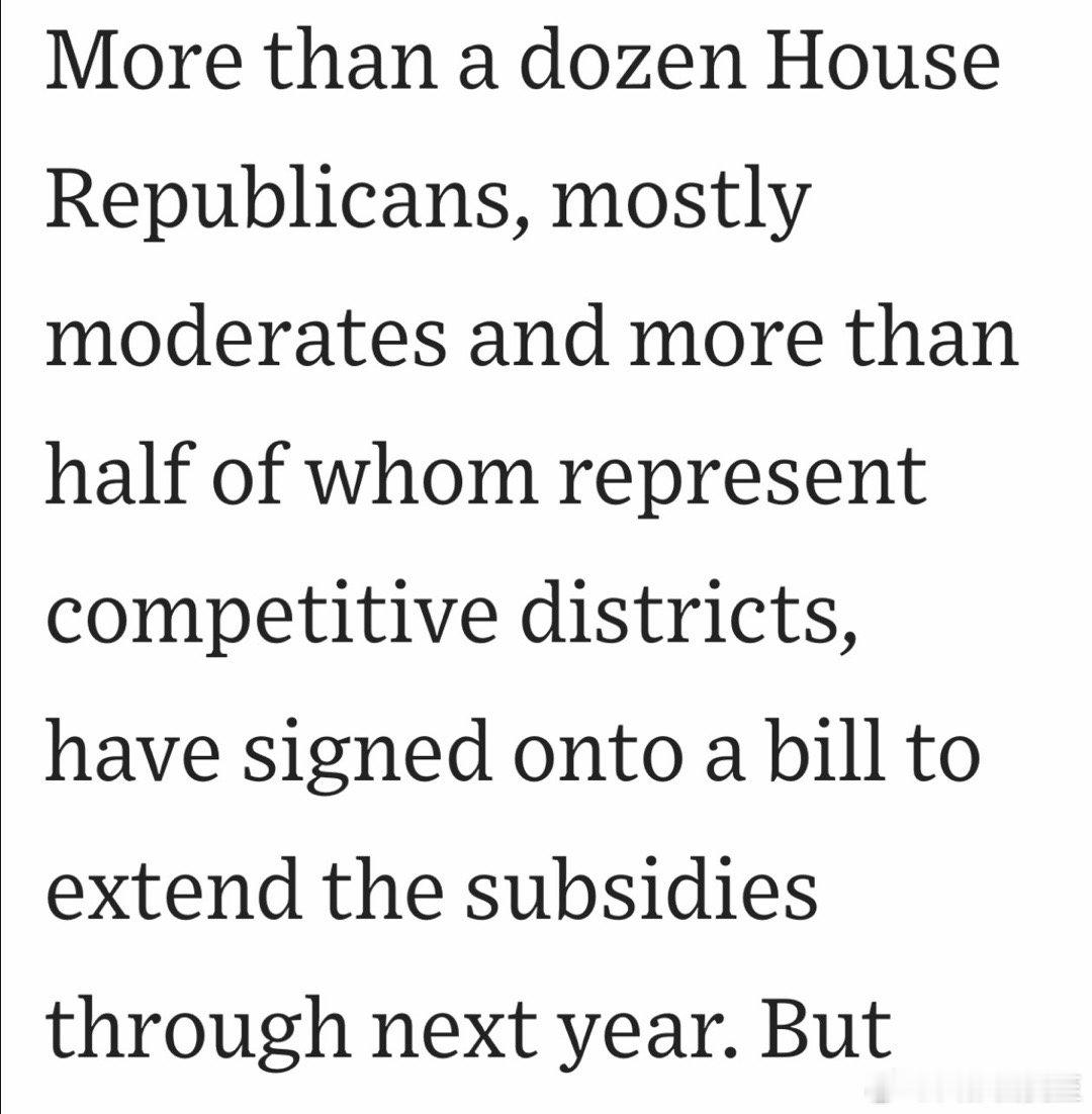 摇摆区共和党议员,很多愿意续医保补贴,但其他共和党政客,没有Trump的同意,不敢投赞同票,所以“政府关门”无法谈判、一直僵持