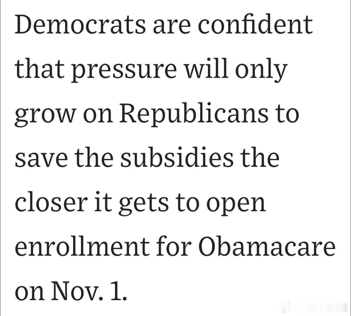 民主党相信,随着注册临近,共和党同意续补贴的压力会增加