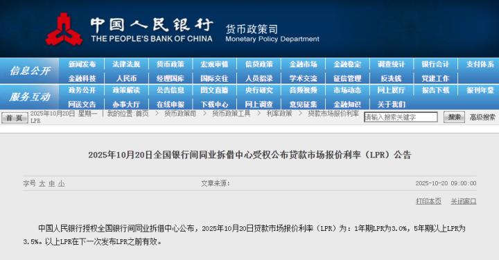 10月20日,中国人民银行授权全国银行间同业拆借中心公布,2025年10月贷款市场报价利率(LPR)为:1年期LPR为3.0%,5年期以上LPR为3.5%。以上LPR在下一次发布LPR之前有效。