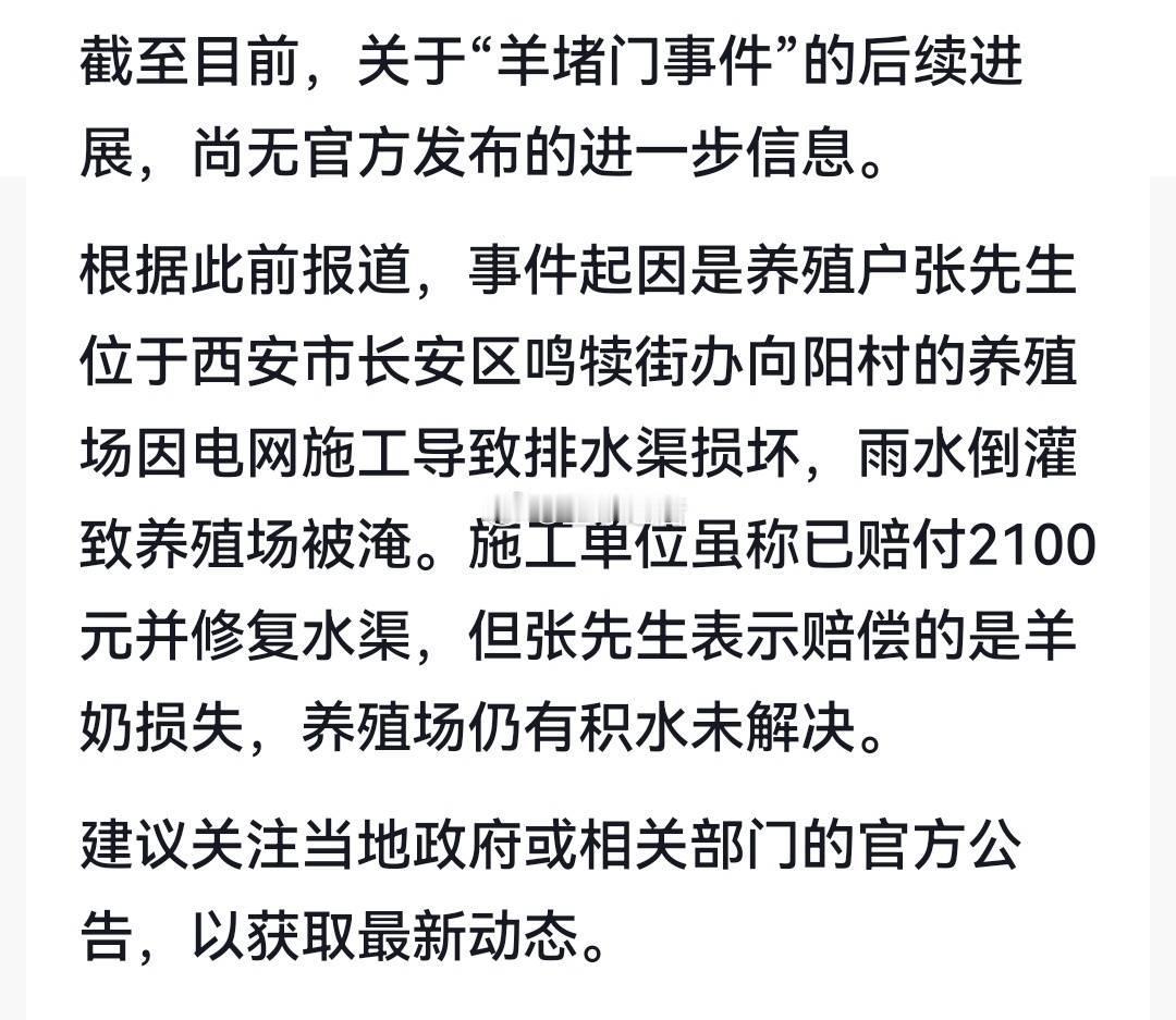 西安一养殖户不满羊圈被淹,赶羊把当地街道办大门给堵了。起因是当地电网施工施工,排水沟渠被堵,叠加西安连日阴雨,漫出的水把羊圈的围墙泡塌了,把羊给淹了。施工单位给养殖户张某赔了2100块,但是张某不满意,认为这只是羊奶的损失,养殖场积水没有解决。这才有了赶羊把鸣犊街道办门口堵了的事件。赶羊牧羊犬 赶牛羊