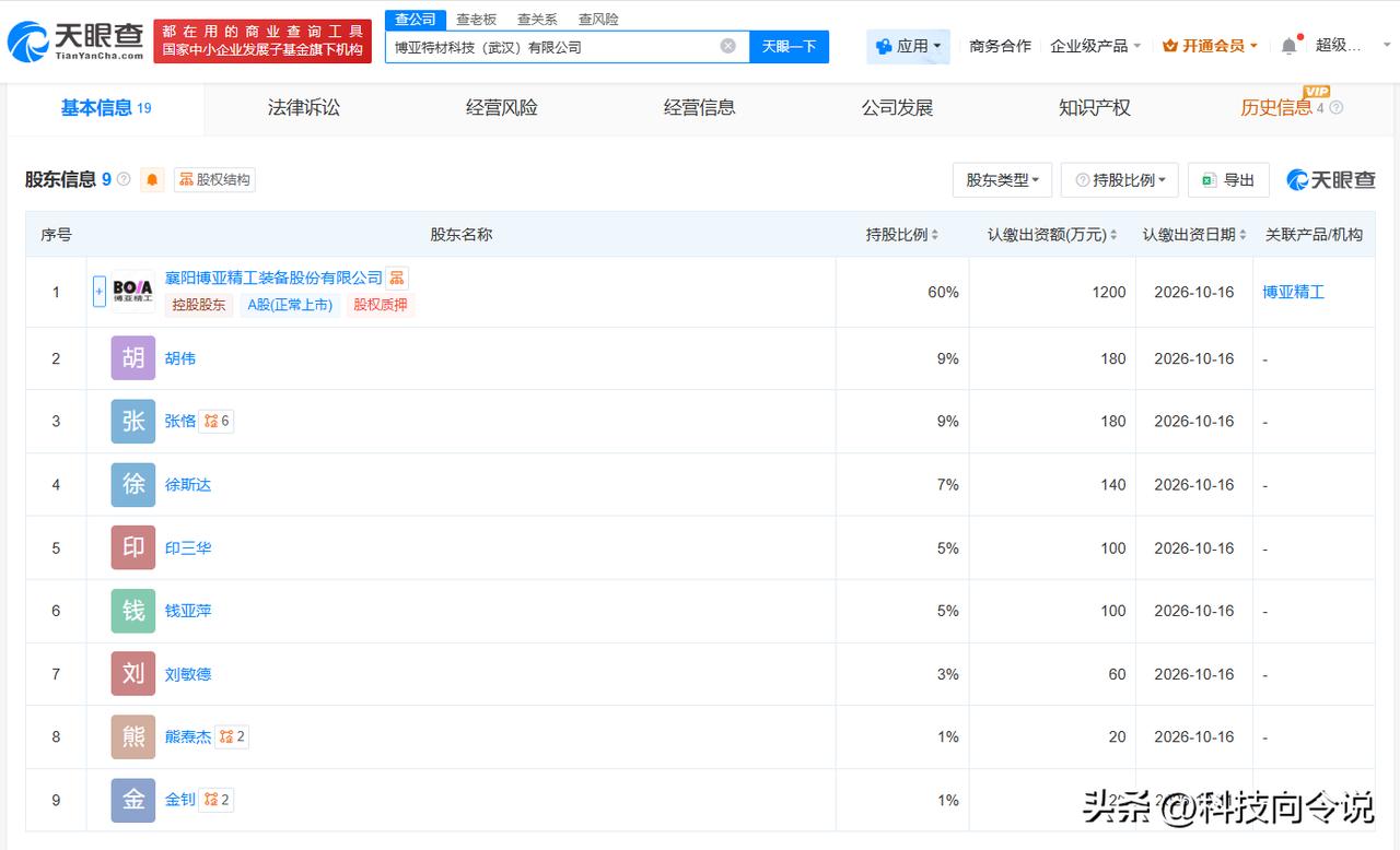 【博亚精工等在武汉成立科技新公司 注册资本2000万】 天眼查工商信息显示,近日,博亚特材科技(武汉)有限公司成立,法定代表人为张恪,注册资本2000万人民币,经营范围包括工程和技术研究和试验发展、人工智能行业应用系统集成服务、工业控制计算机及系统销售等。股东信息显示,该公司由博亚精工(300971)等共同持股。 天眼查信息: