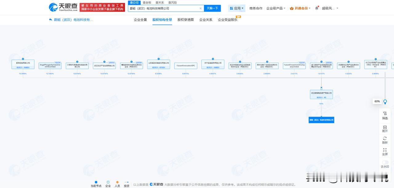 【蔚能在武汉成立电池科技公司 注册资本1亿】 天眼查工商信息显示,近日,蔚能(武汉)电池科技有限公司成立,法定代表人为赖晓明,注册资本1亿人民币,经营范围包括蓄电池租赁、新能源汽车废旧动力蓄电池回收及梯次利用、电动汽车充电基础设施运营等。股权全景穿透图显示,该公司由武汉蔚能电池资产有限公司全资持股,后者由蔚来控股有限公司、宁德时代新能源科技股份有限公司等共同持股。 天眼查信息: