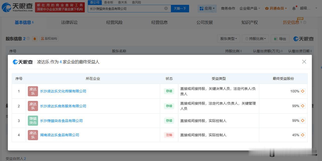 【鹿哈再成立食品公司 鹿哈新公司叫馋猫突击】 天眼查工商信息显示,近日,长沙馋猫突击食品有限公司成立,法定代表人为段金科,注册资本50万人民币,经营范围包括食品销售、食品互联网销售、初级农产品收购、日用百货销售等。股东信息显示,该公司由长沙凌达乐文化传媒有限公司、段金科共同持股。最终受益人信息显示,凌达乐(鹿哈)为该公司实际控制人。 值得注意的是,今年8月,凌达乐(鹿哈)名下的湖南凌达乐食品有限公司刚注销。 天眼查信息:
