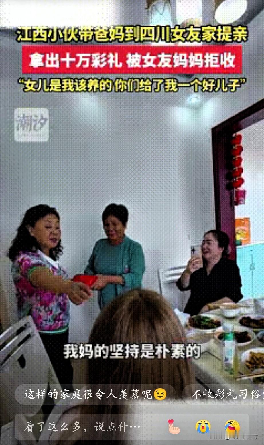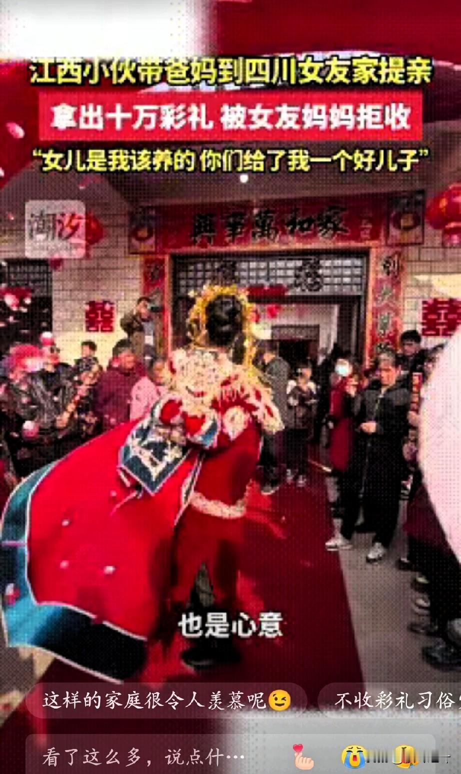 打得措手不及”!近日,江西小伙带着父母凑齐的十万彩礼,千里迢迢赶到四川女友家提亲,出发前还反复跟爸妈确认流程,生怕彩礼的事让女方不满意。 可到了女方家,从见面到午饭,双方热热闹闹聊家常,压根没提彩礼的事,直到饭后小伙妈妈主动拿出红包,没想到下一秒就被女孩妈妈婉拒了。 “孩子结婚是奔着好好过日子,不是为了钱!”女孩妈妈的话特别实在,还说小伙平时总惦记着他们老两口,逢年过节送吃的、帮忙干家务,这份心意比十万块珍贵多了。男方一家人当场红了眼,原本紧张的提亲,变成了满是暖意的相聚。 这事儿一曝光,网友纷纷点赞:“这才是长辈该有的格局!”“比起那些狮子大开口要彩礼的,这位妈妈太清醒了!”如今不少地方,彩礼成了年轻人结婚的“拦路虎”,有的家庭为凑彩礼掏空积蓄,有的情侣因彩礼谈不拢分道扬镳。可这位四川妈妈却明白,婚姻的幸福,从来不是用彩礼数字堆出来的。 孩子的日子过得舒心,两家人相处和睦,才是最实在的“彩礼”。多一份体谅,少一份计较,这样的家庭联姻,日子哪有不红火的道理?