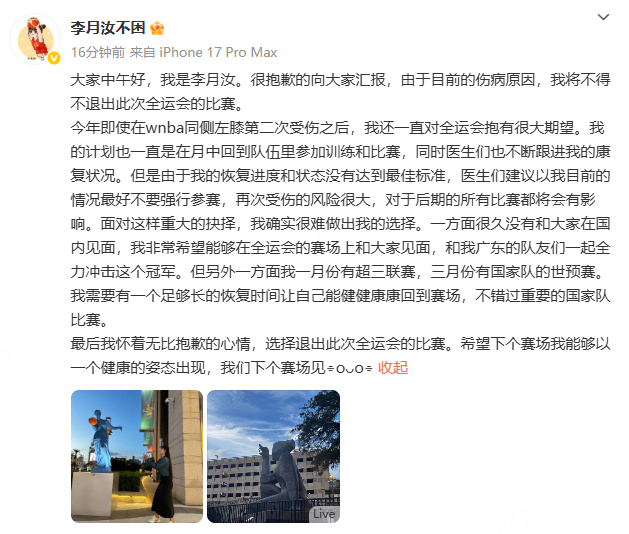 李月汝表示,她渴望和广东的队友们一起全力冲击冠军,但她也表示需要有一个足够长的恢复时间让自己能健健康康回到赛场,不错过重要的国家队比赛。