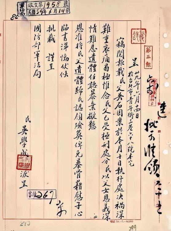 吴学成当年写信领遗体的勇气,只是怕父无葬身地。这封信写于1950年6月14日。奇迹般地,第二天,军法局批了:准予领取。条件是不能声张,不能办丧事,更不能对外说。 (信源:百度百科——吴学成) 1950年初夏的台北,空气里弥漫着一种压抑的气息。街口的公告栏上贴满了“匪谍案”判决,马场町的枪声隔三差五响起。就在这样一个年代,一个年轻人,提笔写下了一封命悬一线的信。他叫吴学成,那个被处决的中将吴石,就是他的父亲。那一年,他二十几岁,信的内容不长,却写出了一个儿子最纯粹的恐惧——怕父亲暴尸荒野,无处安息。 吴石案的风暴在台湾几乎无人不知。1949年后,国民党政权退守台湾,对岛内潜伏的中共地下组织展开大规模清查。吴石,中将军衔,曾任国军参谋次长,被控“通共叛乱”。他的名字在情报档案中被标红,在军法局的文件里,他是“敌特头目”。所有与他有牵连的人,都成了靶子。家族被监控,亲友被问讯,连邻居都不敢上门探望。 那一年春天,吴石与朱枫等人被捕。案件进展神秘,外界只听到传闻——有人交代,有人叛变,有人彻夜被审。5月30日,军法局宣布判决:吴石、朱枫等人死刑。消息传出,吴家陷入沉默。没有人敢上街打听,也没有人敢去探监。夜里风声一大,家人就会以为警车又停在门口。 6月10日清晨,马场町传来几声短促的枪响。吴石的生命在那一刻定格。消息被严密封锁,遗体去向不明。坊间传言,他被草草埋在乱葬岗,连标志都没有。吴学成辗转得知消息后,整夜未眠。他知道,那具遗体可能再不见天日。第二天,他提笔写信,信开头只有一句:“吾父死于军法,请准许领回遗体安葬。” 那封信写得克制、冷静,却藏着压抑到极致的情绪。他没有喊冤,也没有辩解,只是请求能让父亲入土为安。信件送往军法局,仿佛一粒石子扔进深潭。没人敢抱希望。可奇迹般地,6月15日,批文下来了——准予领取,但不得声张,不得办丧事,更不得对外提及。 那一刻,吴学成手中的纸几乎在抖。军法局的印章像一块烙铁,既沉重又冰冷。批准的背后,可能是某个官员的一念之仁,也可能只是程序上的疏忽。没人知道缘由。吴学成拿到批文,独自前往马场町。他穿着最旧的衣服,带上麻绳与草席。烈日下,刑场的泥地混着血迹,他在角落找到了父亲的遗体。 那具身体被枪击穿胸,衣襟上还有泥土与灰烬。没有棺材,没有碑文,只有一个儿子的双手,将那具遗体一点一点抬上草席。目击者后来回忆,吴学成的背影孤单而坚决。一路走过警卫岗,他没敢抬头。那一程,像是送父亲回家的最后一段路。 回到家中,吴家没有哭声。屋子关着窗,邻居也装作不知。遗体暂放一夜,第二天,家人用土罐做了临时棺。没有仪式,没有亲友相送。唯一的陪伴,是几根蜡烛和一封被汗水打湿的批文。有人说,那夜台北下了小雨,屋顶滴水声与哭声混在一起,像一段不敢被记下的哀歌。 几十年过去,吴学成的那封信被保存了下来。信纸泛黄,笔迹清晰。那不是英雄宣言,而是一份对亲人的执念。后来在台湾学界整理吴石案时,研究者称这封信是“冷战档案中的人性碎片”。在冰冷的政治对立中,一个儿子的举动成了唯一的温度。 吴石案在台湾史上留下复杂印记。政治宣传里,它是“破获的匪谍阴谋”;而在历史档案中,它是一场血与忠诚的悲剧。多年后,台湾的“促转会”重启平反调查,承认该案审判存在瑕疵。吴石、朱枫等人的姓名被重新提起。岛内的老记者说,那些被枪决的人,并非叛国,而是理想的殉道者。 吴学成一生没再提起那封信。家人说,他只是偶尔去墓前坐坐,点根香,不说话。那个墓没有碑,只是一块被风吹平的小土丘。也许是命运的讽刺,吴石用生命写下忠诚,儿子用沉默保存尊严。政治的浪潮掀起多少喧嚣,到头来,只剩下父与子的一次拥抱。 如今回望,那封写于1950年6月14日的信,字句间透出的,不是抗争,而是克制。一个普通人面对体制的冷漠,唯一能做的,就是让亲人不被遗忘。那是恐惧中的温柔,是绝境里的勇气。每个历史档案背后,或许都藏着这样一封信——短短几行,却比枪声更有回响。